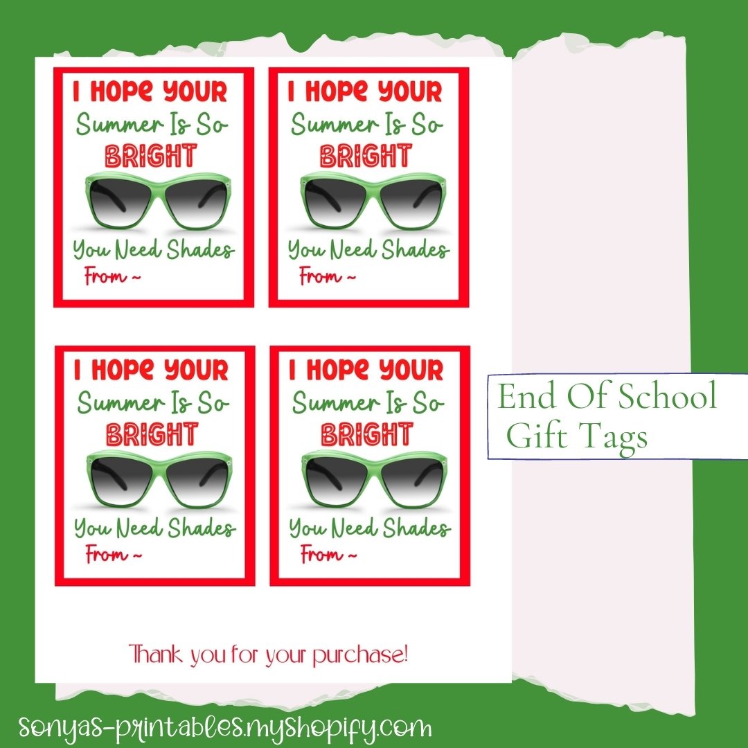 I hope your summer is so BRIGHT you need shades ~ end of the school year gift tag. Just wrap one of these around a pair of child's sunglasses and give them out to your child's friends during the last week of school. PERFECT!