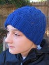 A very manly hat, this hat was designed with great assistance from my then 12 year old son. He had very specific ideas what he wanted for his hat – Gator blue, fold-up brim, no girly designs! He even sketched and named the hat himself, and we chose the stitch pattern together. This hat is worked in the round. This can be done on a 16” circular with dpns used for the decreases, or you can work the entire hat magic loop style.