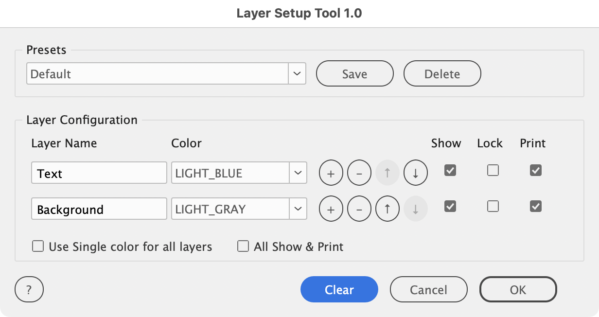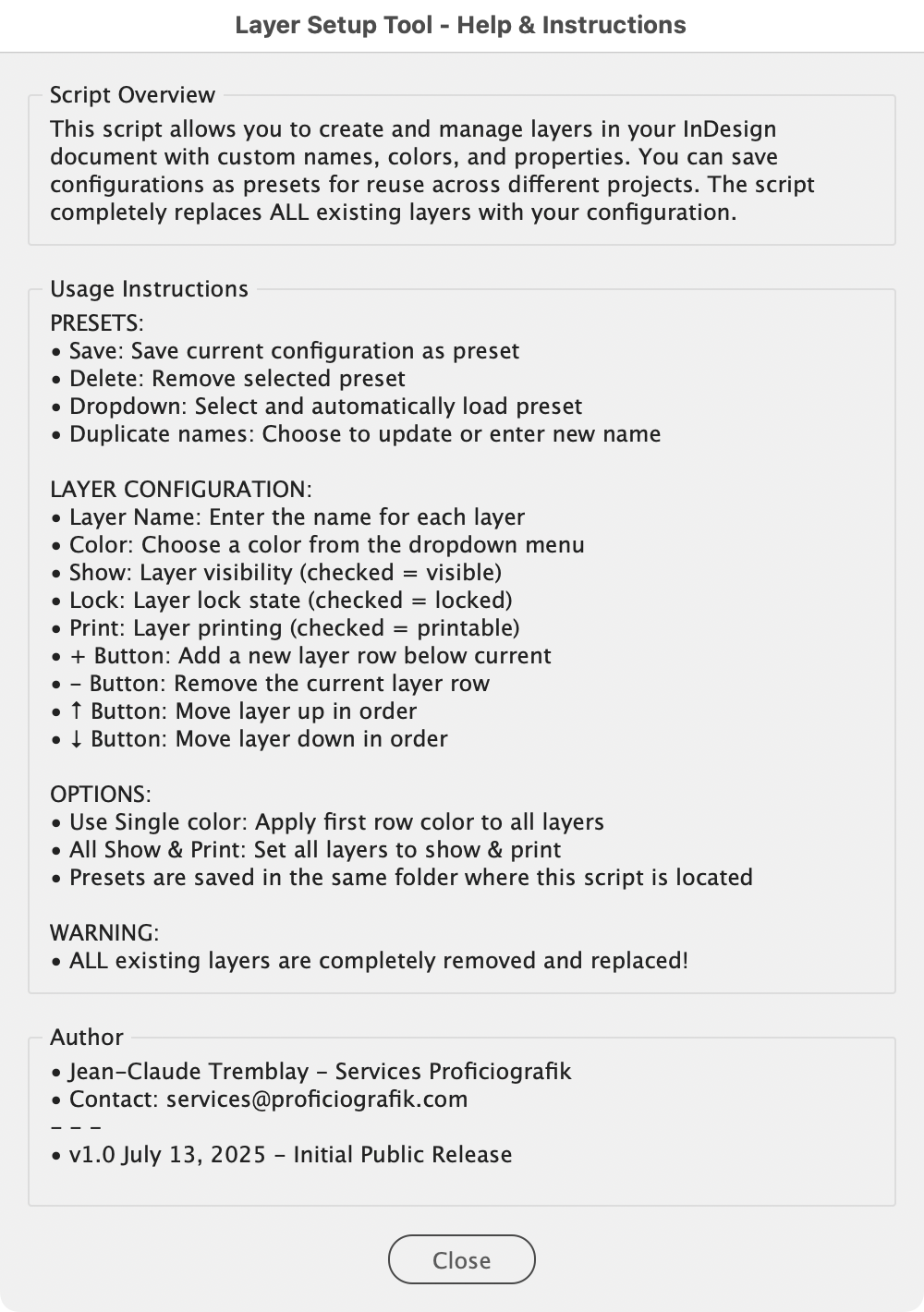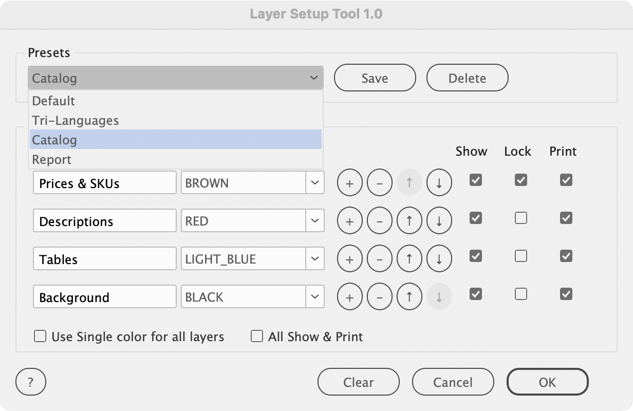 The Layer Setup Tool is a comprehensive Adobe InDesign script that streamlines layer management workflow by providing an intuitive interface for creating, configuring, and organizing document layers. Users can easily set custom layer names, assign colors from InDesign's full color palette, and control visibility, lock status, and print settings for each layer.