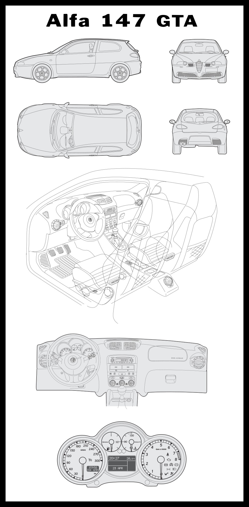 Alfa Romeo 147 GTA Car Blueprint PDF SVG Vector Drawing.