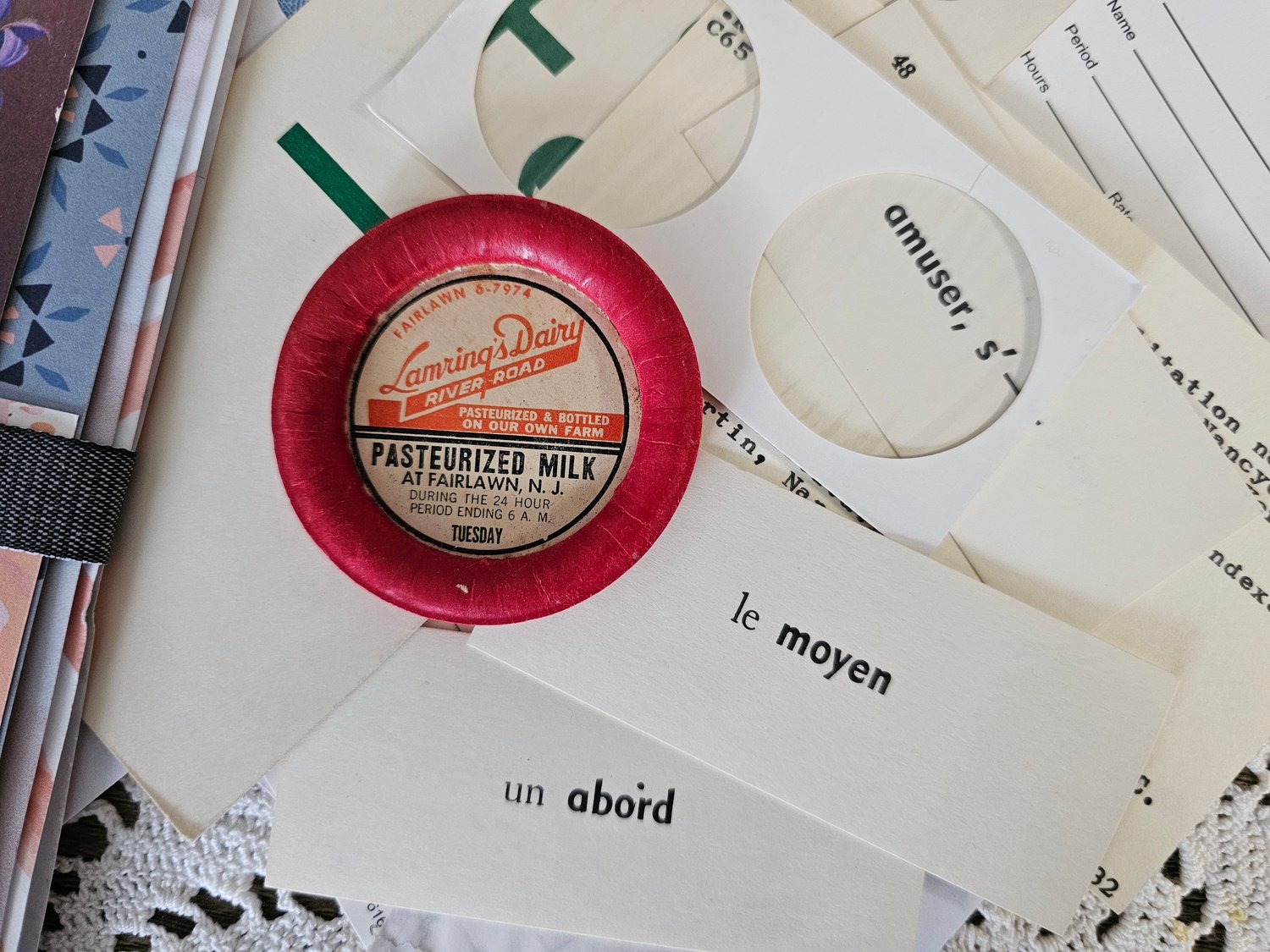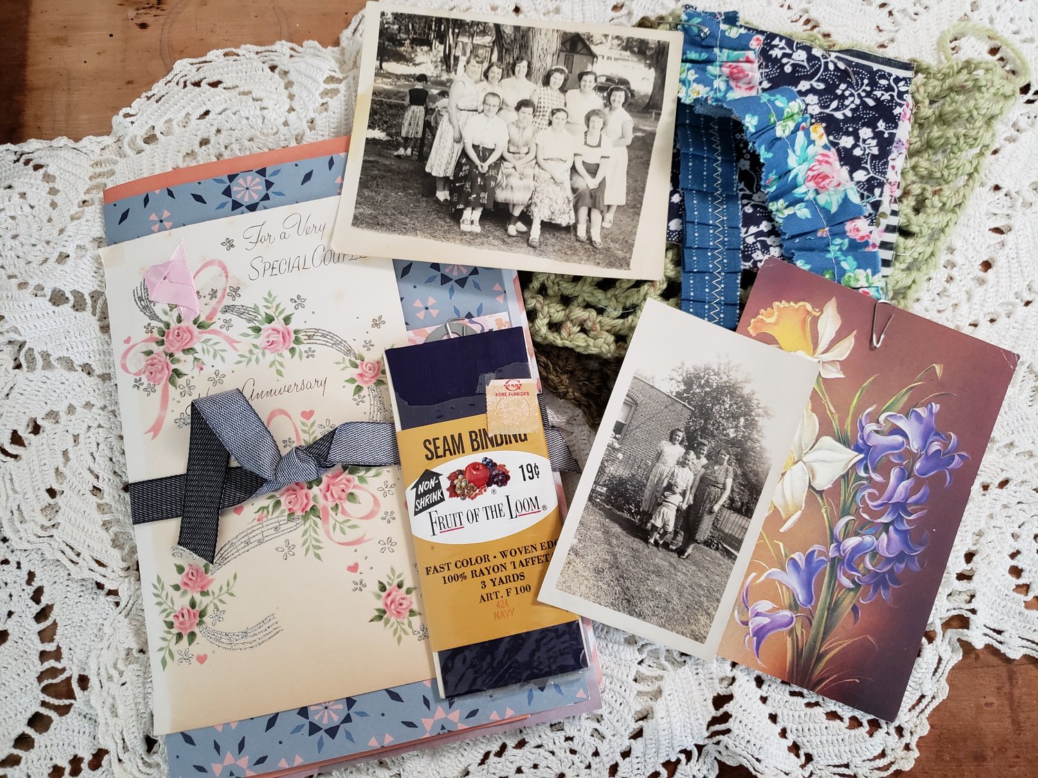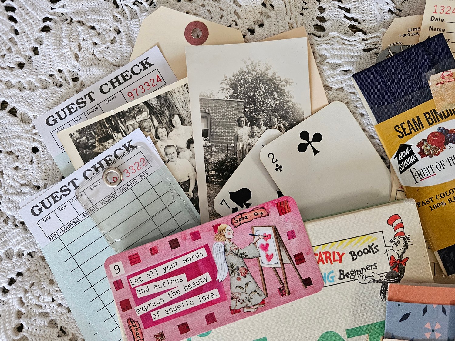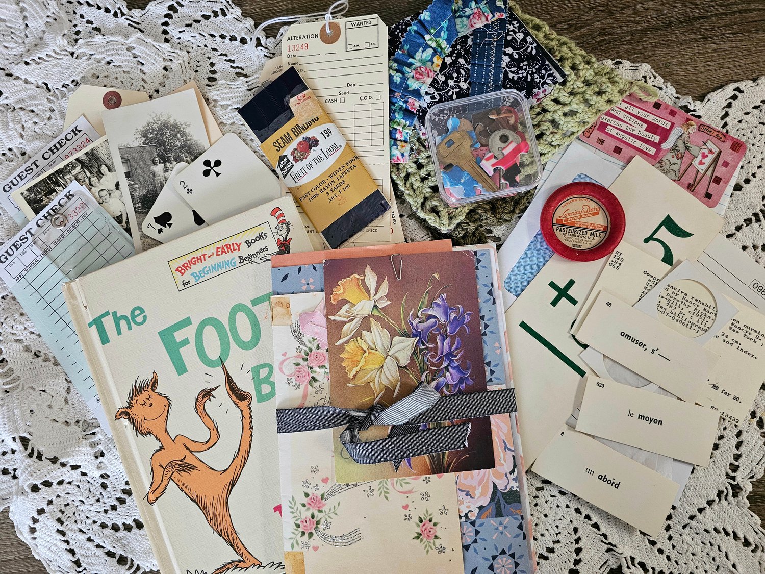 This kit gives you endless ways to incorporate the supplies into your junk journal projects! Includes a vintage children's book, assorted paper and book pages to make journal pages, fabric scraps for slow stitching and embellishing, vintage seam binding, ephemera, trinkets and more.