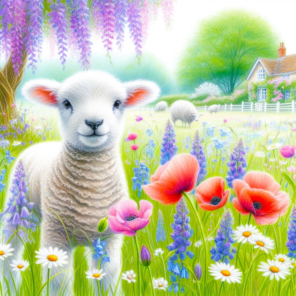 Adorable lamb in a meadow with long grass & poppies, bluebells, & daisies. There is a wisteria tree & in the distance there is a small cottage.