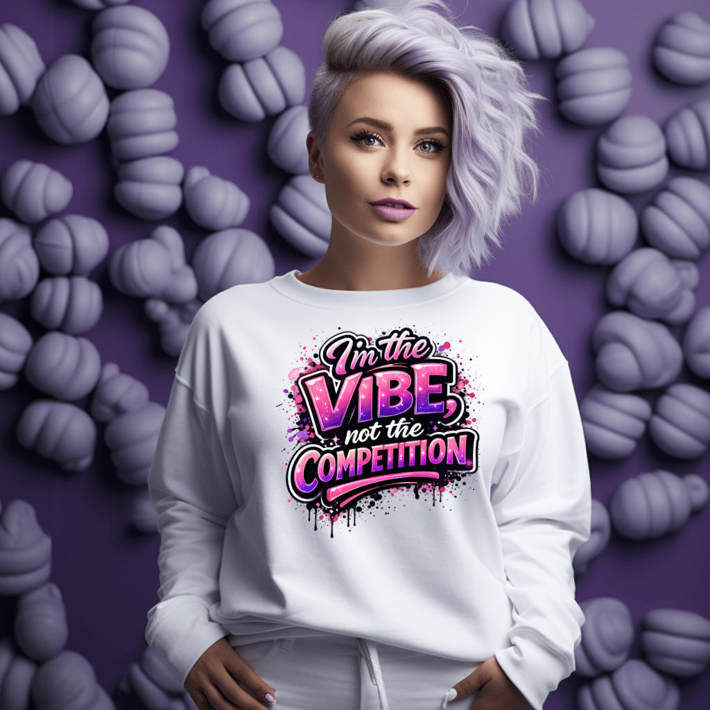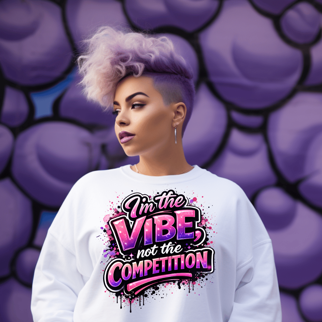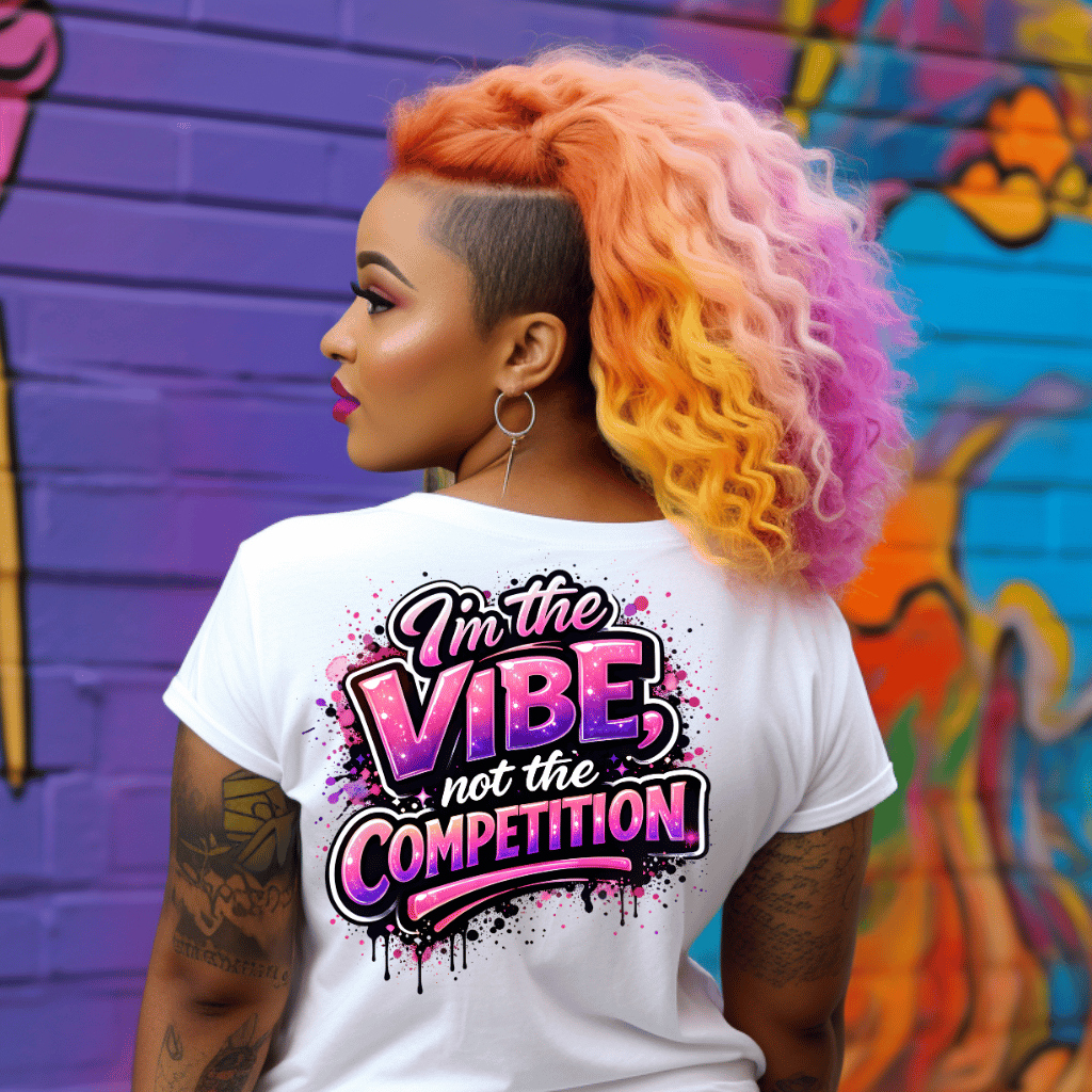 This “I’m the Vibe, Not the Competition” design is a bold declaration of confidence, self-worth, and individuality. Featuring vibrant pink and purple gradient typography with paint splatter accents, this design is made to stand out and speak volumes.