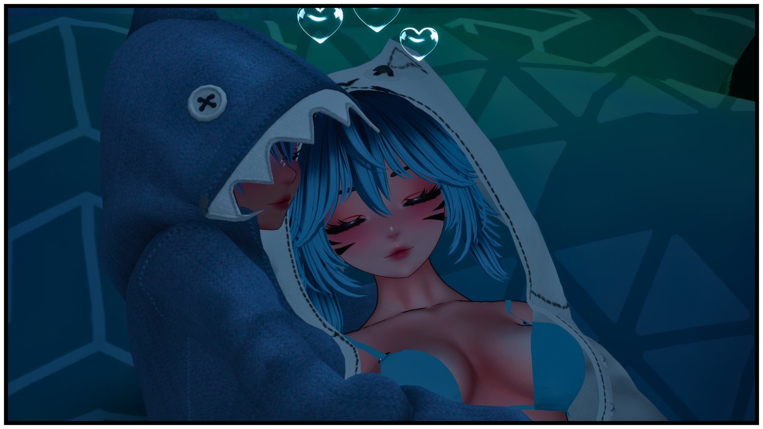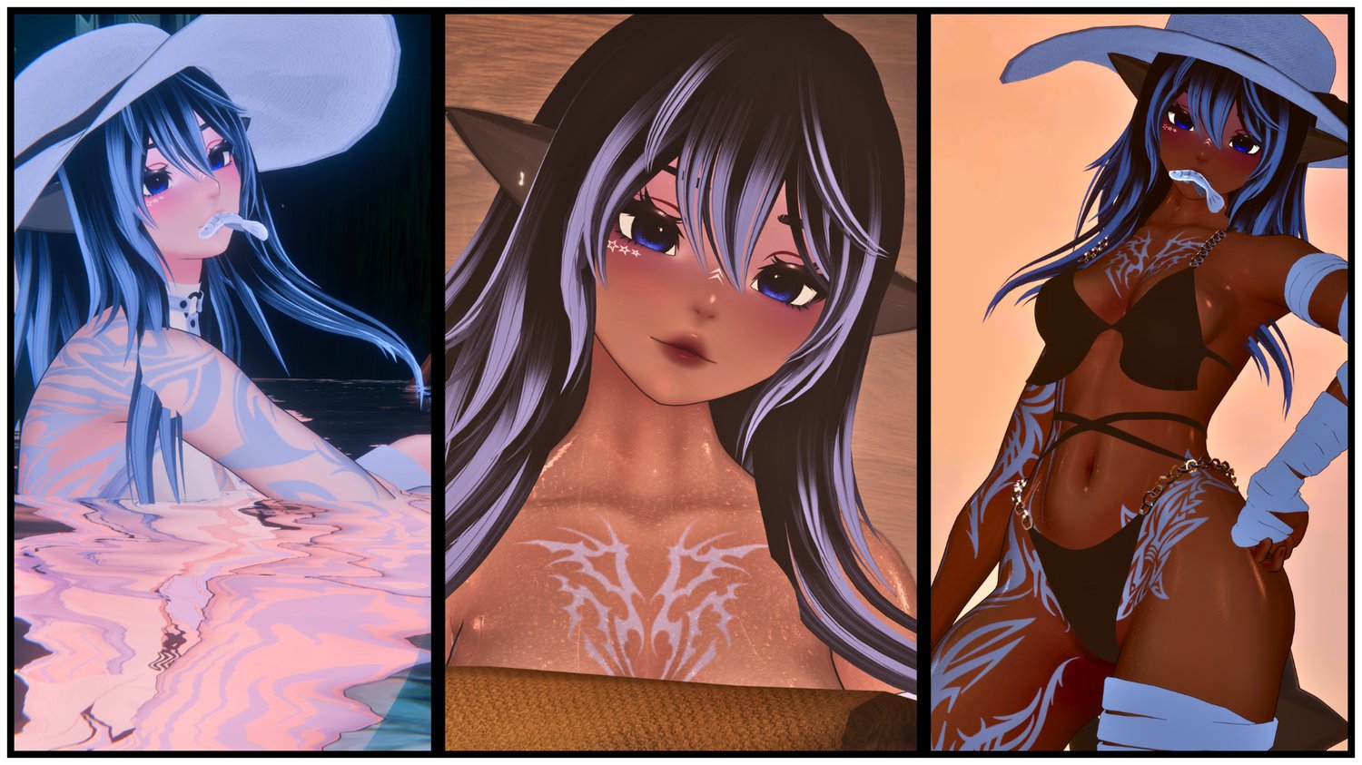VRBASE E-Girl (Sculpted by me), Bodysuit (Edited by me), Shorts, Harness by Zinpia, Body texture by Maddiiee, Tattoo (edited by me), Straps by gelw0, Face-tracking by Threevee, Onsie by Suki, Bikini by Moon Jelly, Fishies by GM's Box, Shark parts by Pirranhaz, Hat by Blake_CID, Menu Icons by Floof, Items not listed were made by me or custom-made for me.
