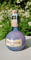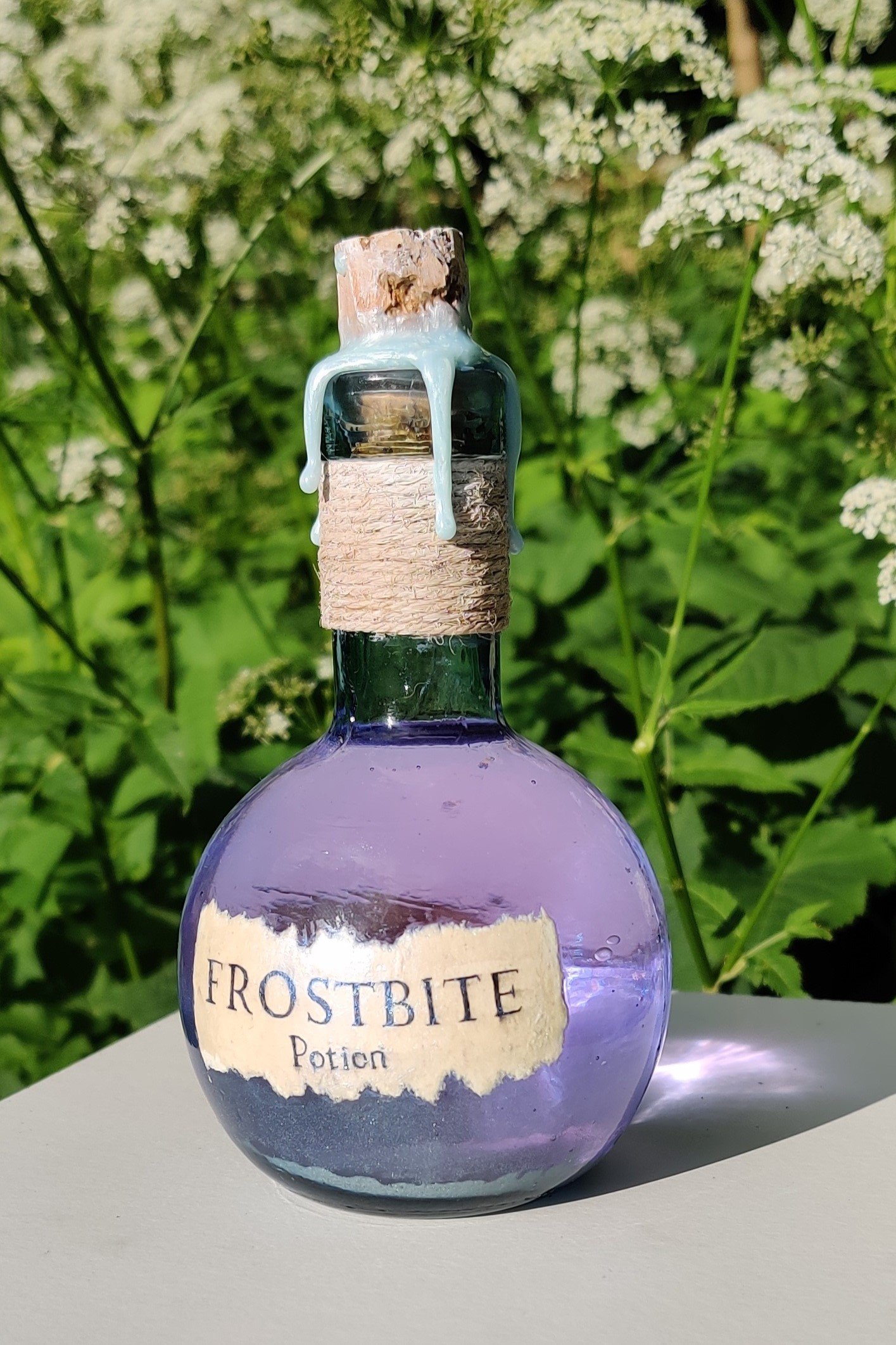 Pullossa on kirkasta, sinertävää nestettä ja se on koristeltu käsintehdyllä etiketillä ja värjätyllä juuttinarulla.