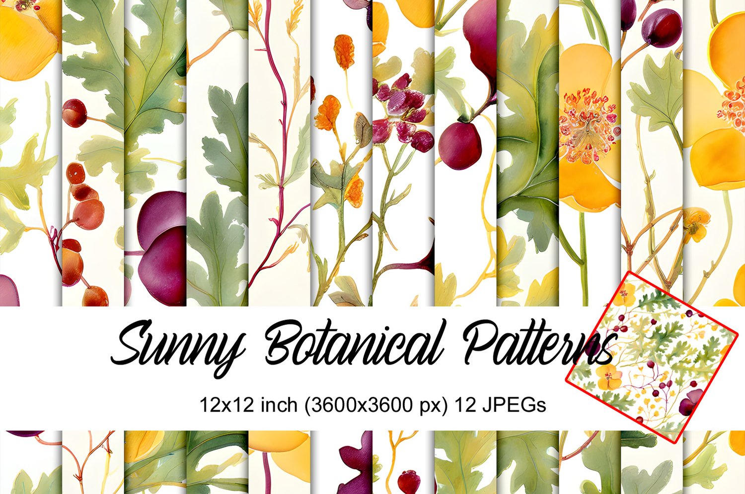 Bring the brightness of a summer meadow to your projects! Our Sunny Botanical Patterns collection features 12 gorgeous, hand-painted style watercolor designs. This set is a beautiful dance of vibrant yellow poppies, deep plum-colored berries, and delicate green foliage, all perfectly balanced on a soft cream background.