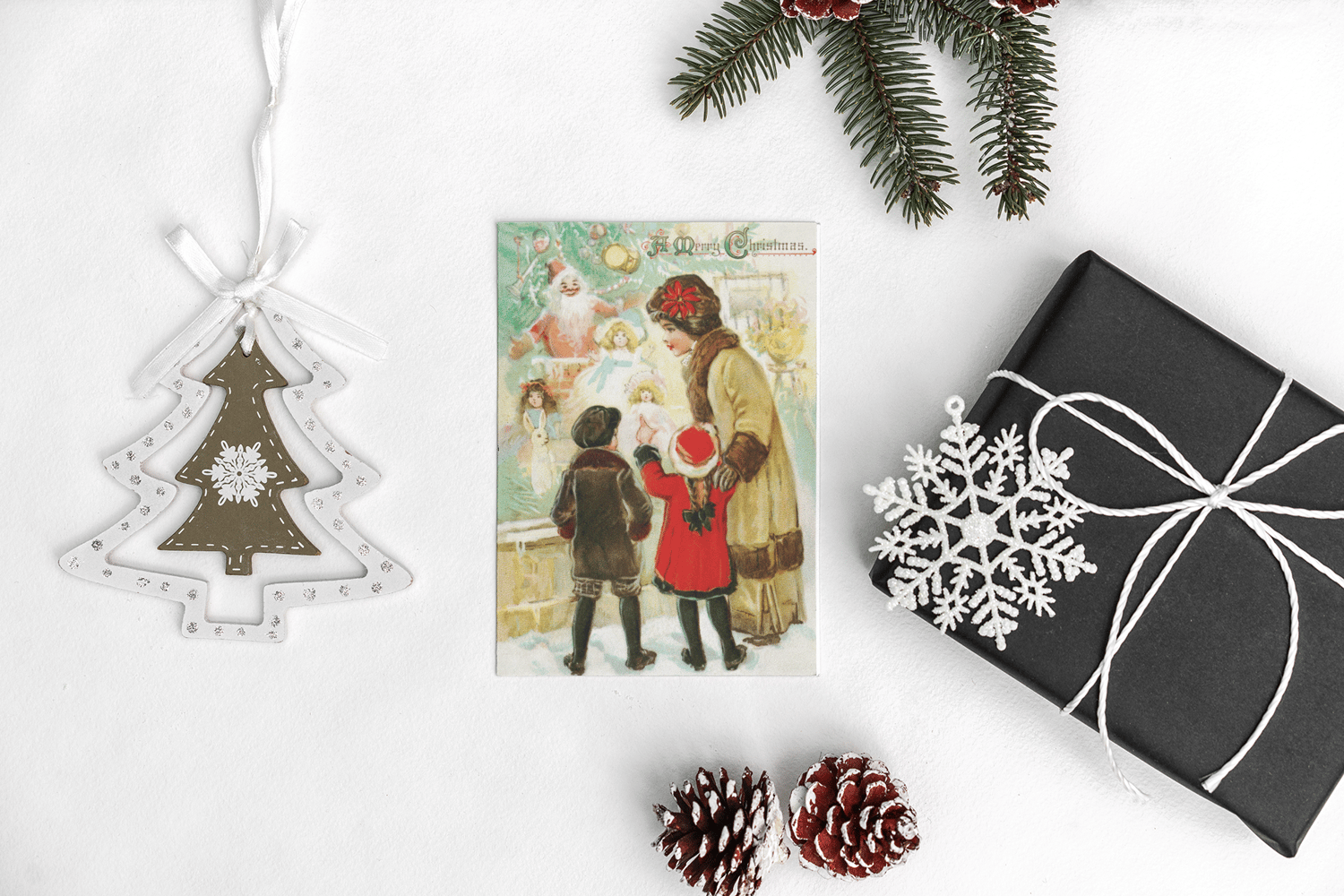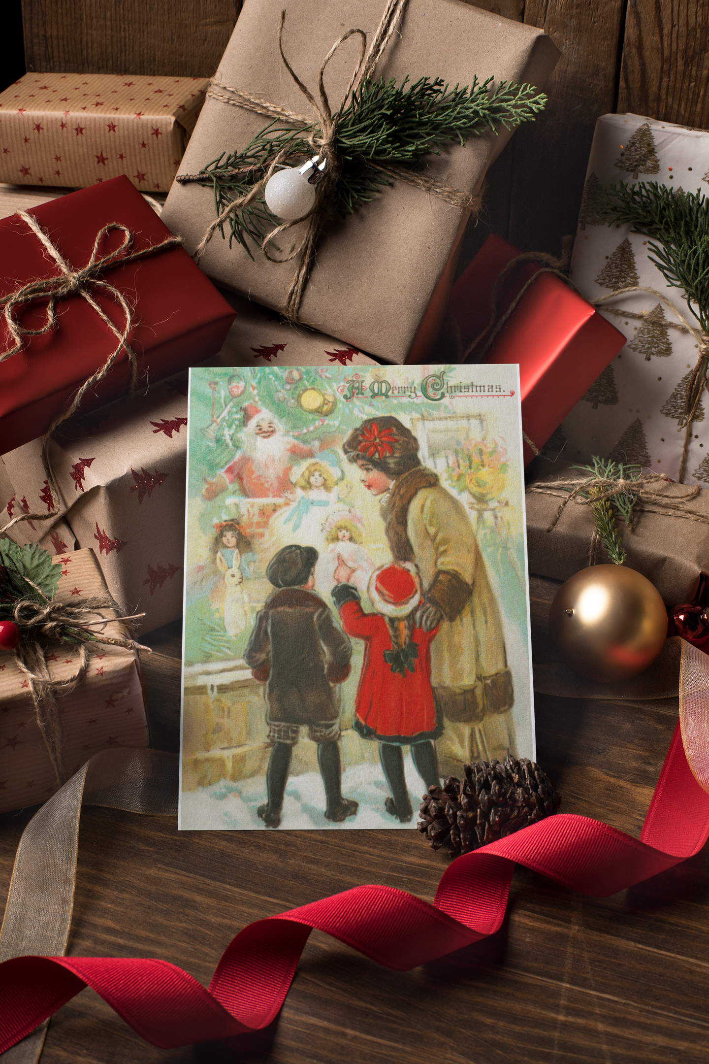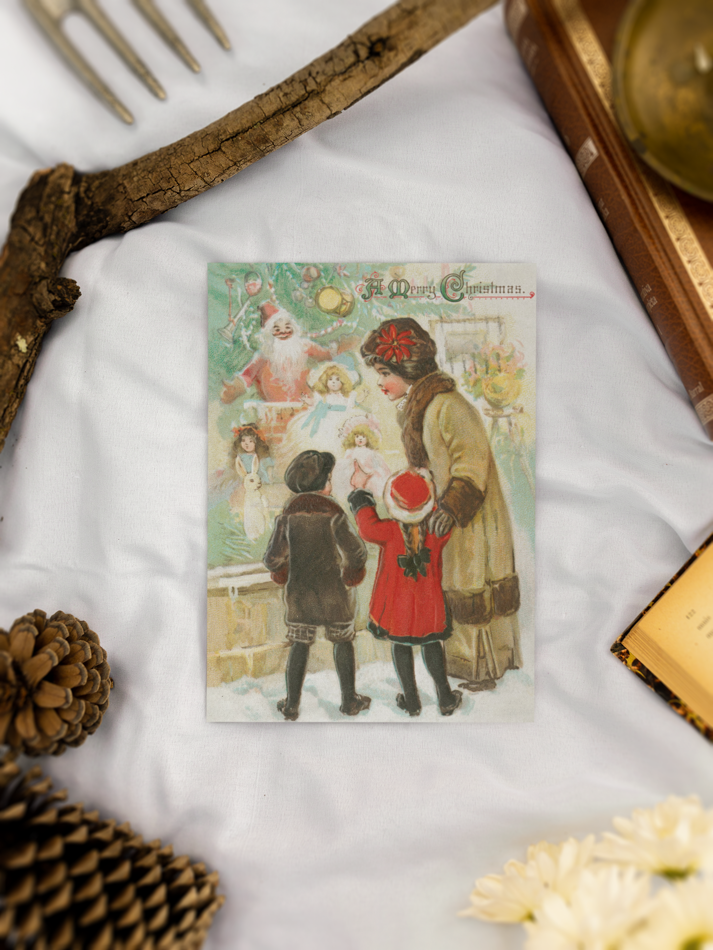 Step back in time with this heartwarming vintage postcard featuring a festive Christmas scene of a mother and her children gazing at a shop window filled with toys, ornaments, and a cheerful Santa display. This nostalgic illustration captures the magic and wonder of the holiday season, making it perfect for holiday-themed projects such as scrapbooking, card making, gift tags, or seasonal decor. Bring a touch of vintage holiday charm to your creative projects with this high-quality digital postcard.