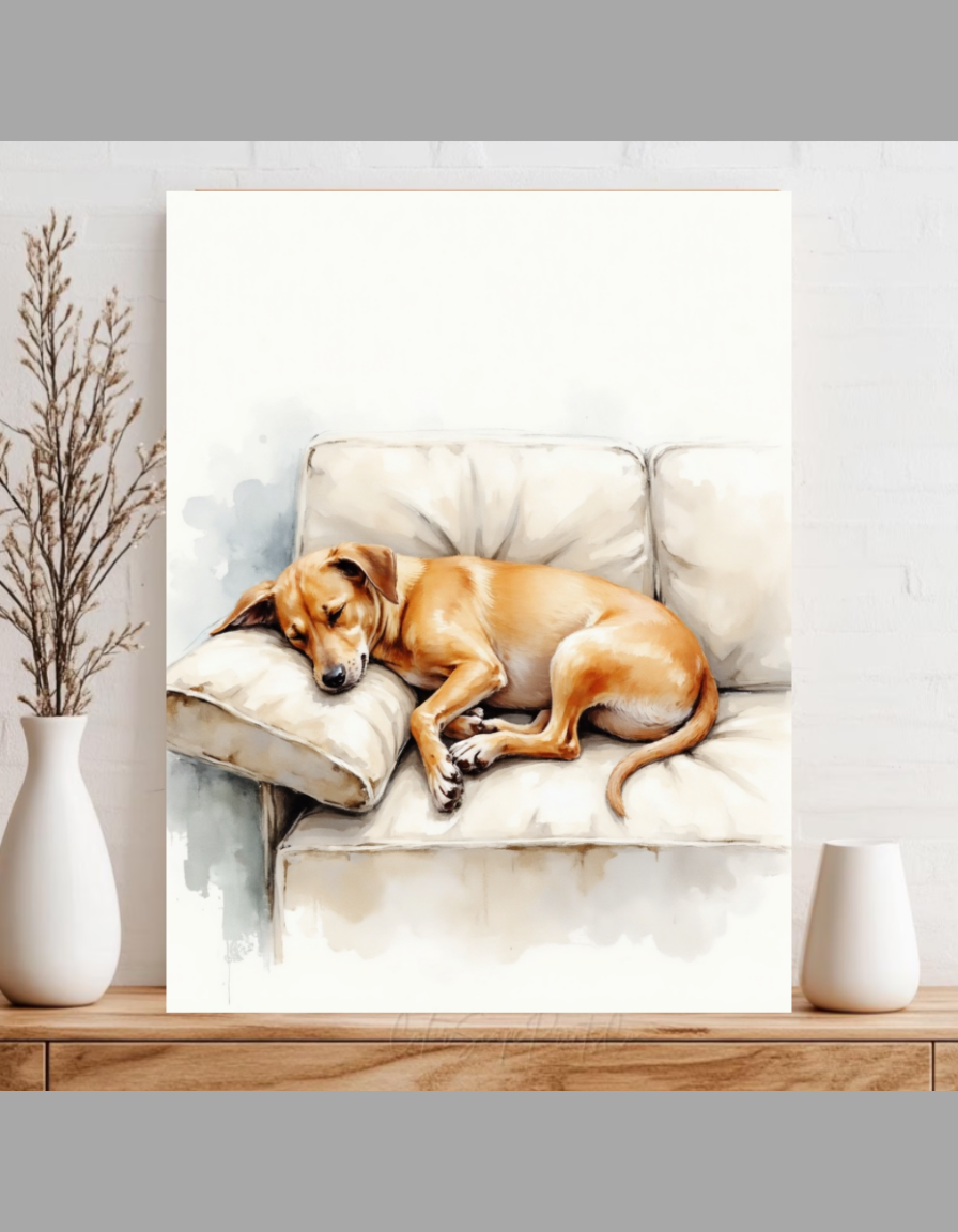Sleeping Potcake Dog on Sofa - Cozy Watercolor Pet Art Print