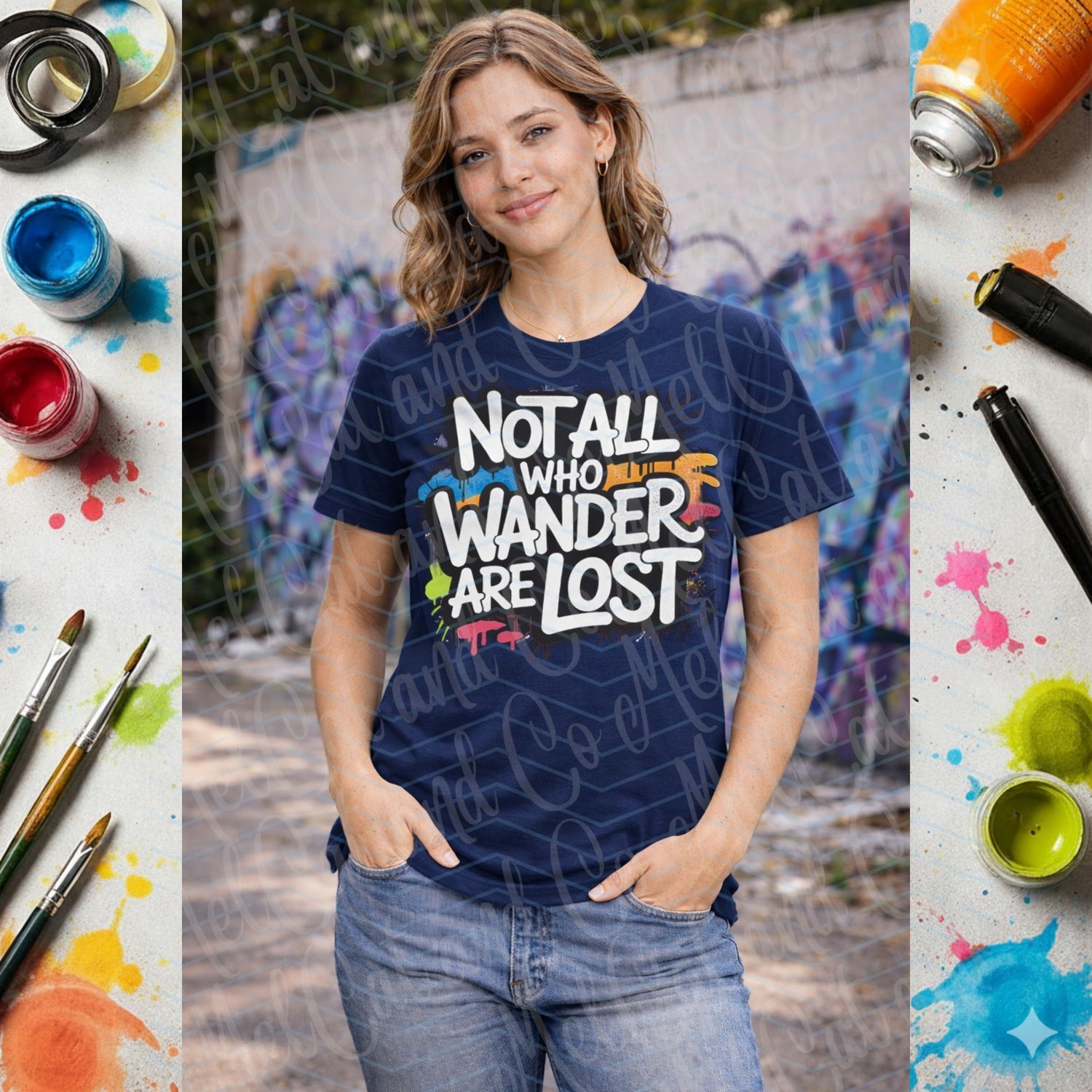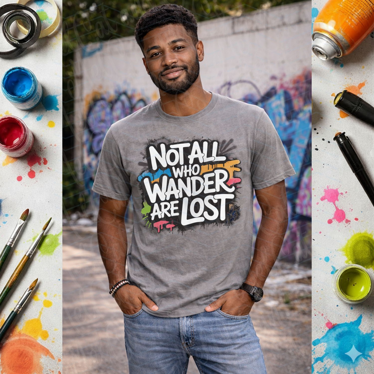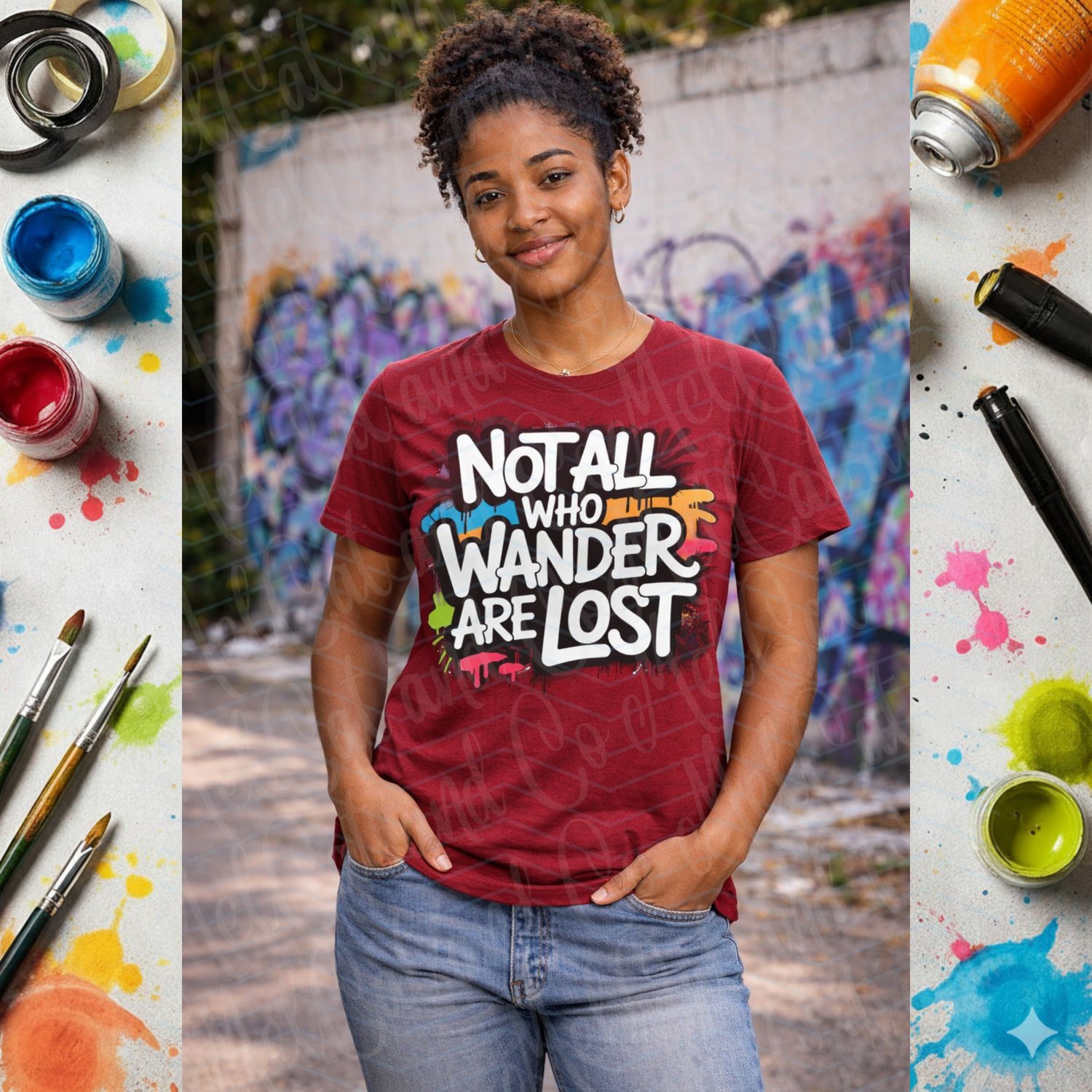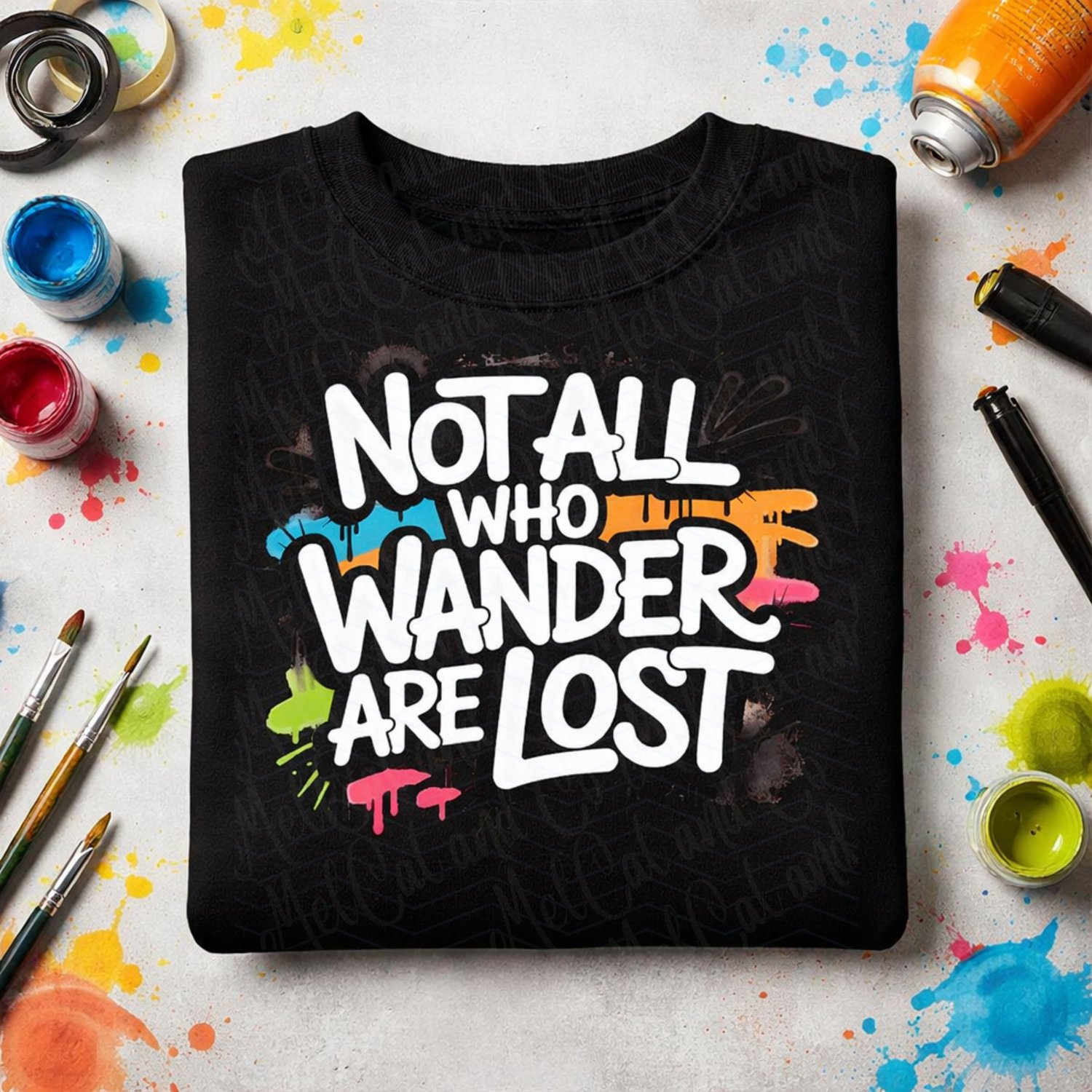 Make a bold statement with this “Not All Who Wander Are Lost” digital design, featuring eye-catching graffiti-style lettering with vibrant paint splashes and modern urban flair. Perfect for creators, small business owners, and DIY makers looking to add a powerful message to their apparel or merchandise.