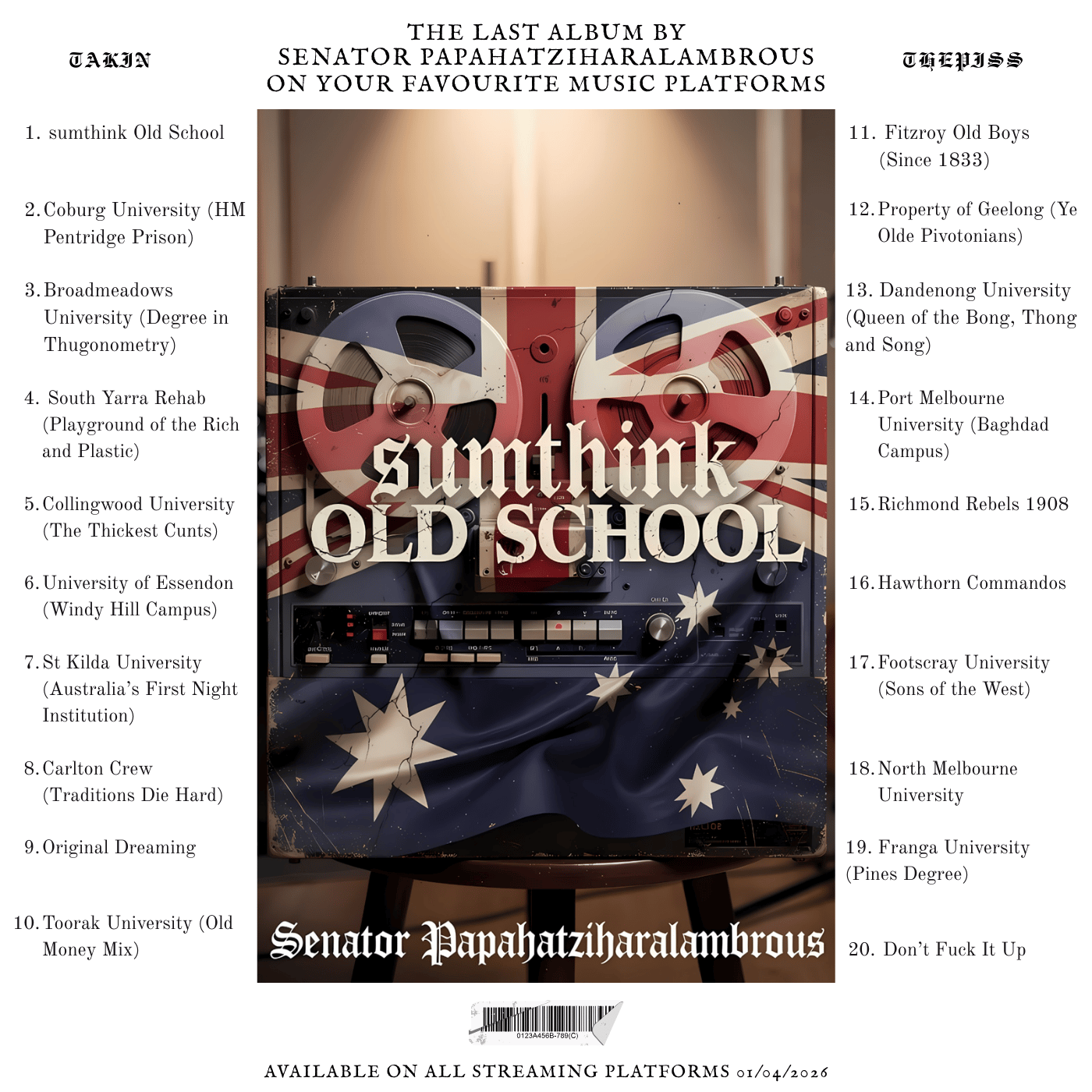 Listen up, legends – if you’re not already frothing at the mouth for Senator Papahatziharalambrous’ final banger album ”sumthink Old School”, then strap in because the FOMO is about to hit harder than a Sherrin to the scone.