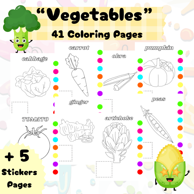 🥕 Vegetables Coloring Book for Kids – 41 Veggie Fun Pages + 5 Bonus Sticker Sheets! 🥦
