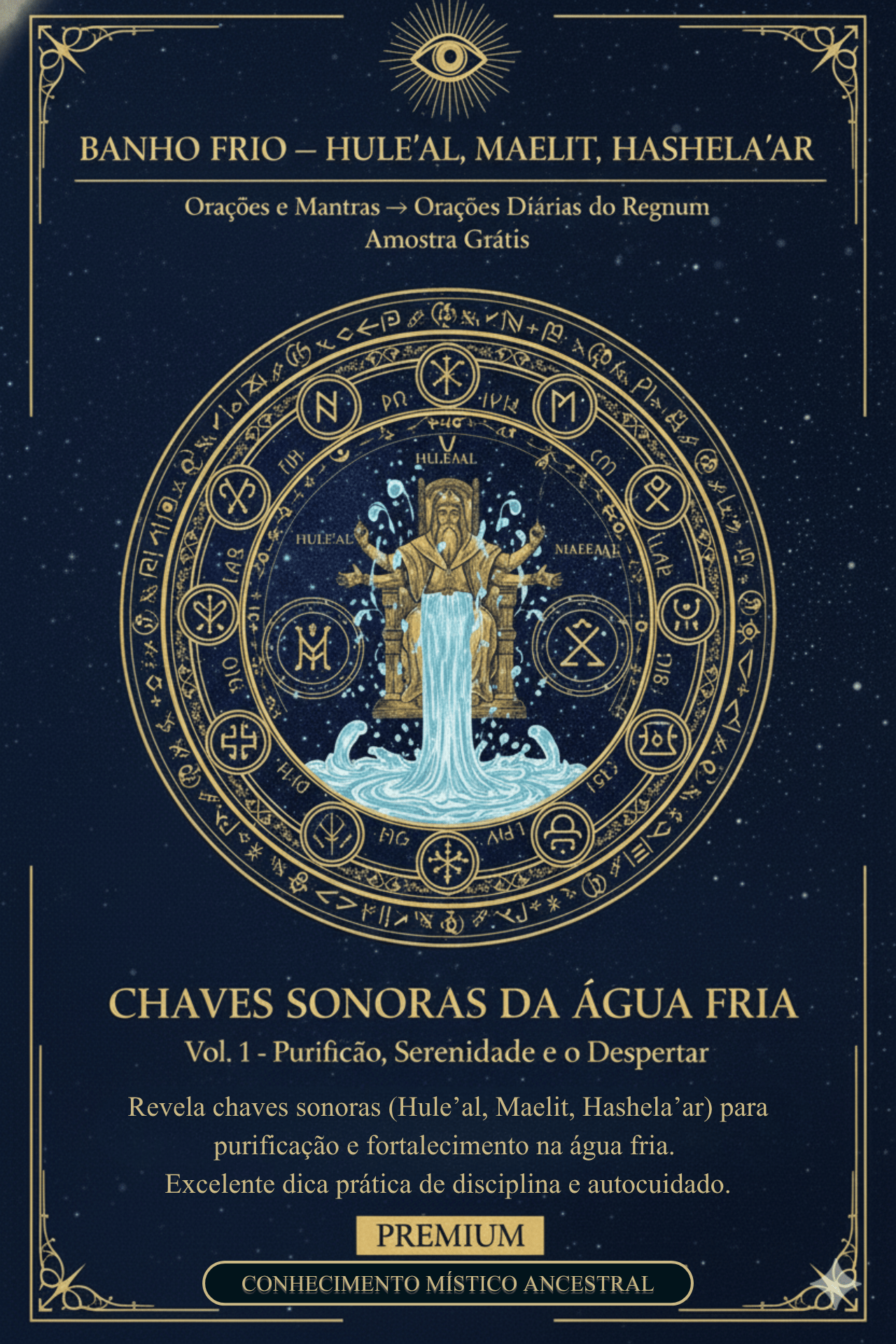 Este e-book transforma a disciplina física do banho frio em um ritual alquímico de purificação e fortalecimento da vontade. O material revela as três chaves sonoras arcanas – Hule'al, Maelit e Hashela'ar – que, quando pronunciadas, ativam o Sopro da Clareza, o Fio da Força e a Lâmina da Purificação na água. É um manual prático para a limpeza do Verbo, o corte de larvas e sombras, e a expansão da alma.
