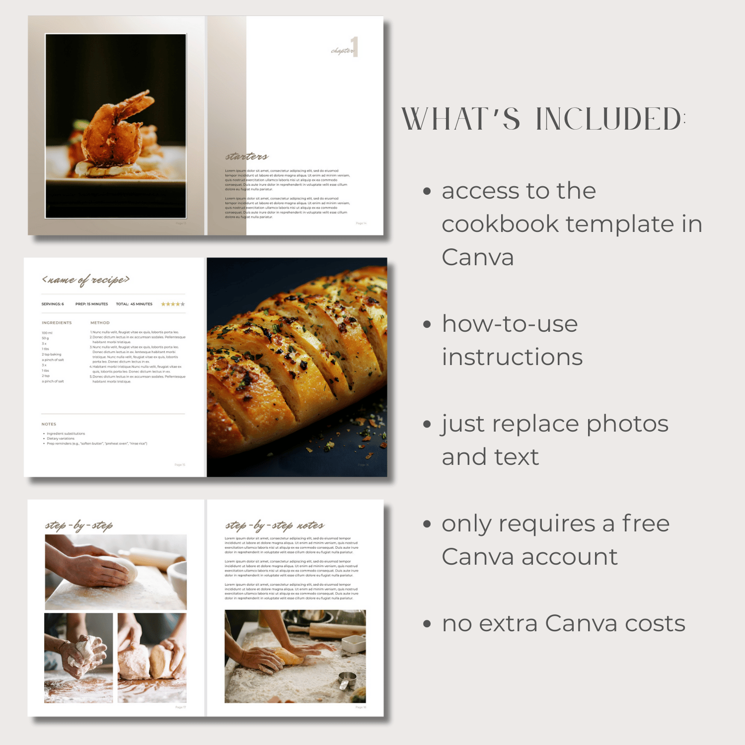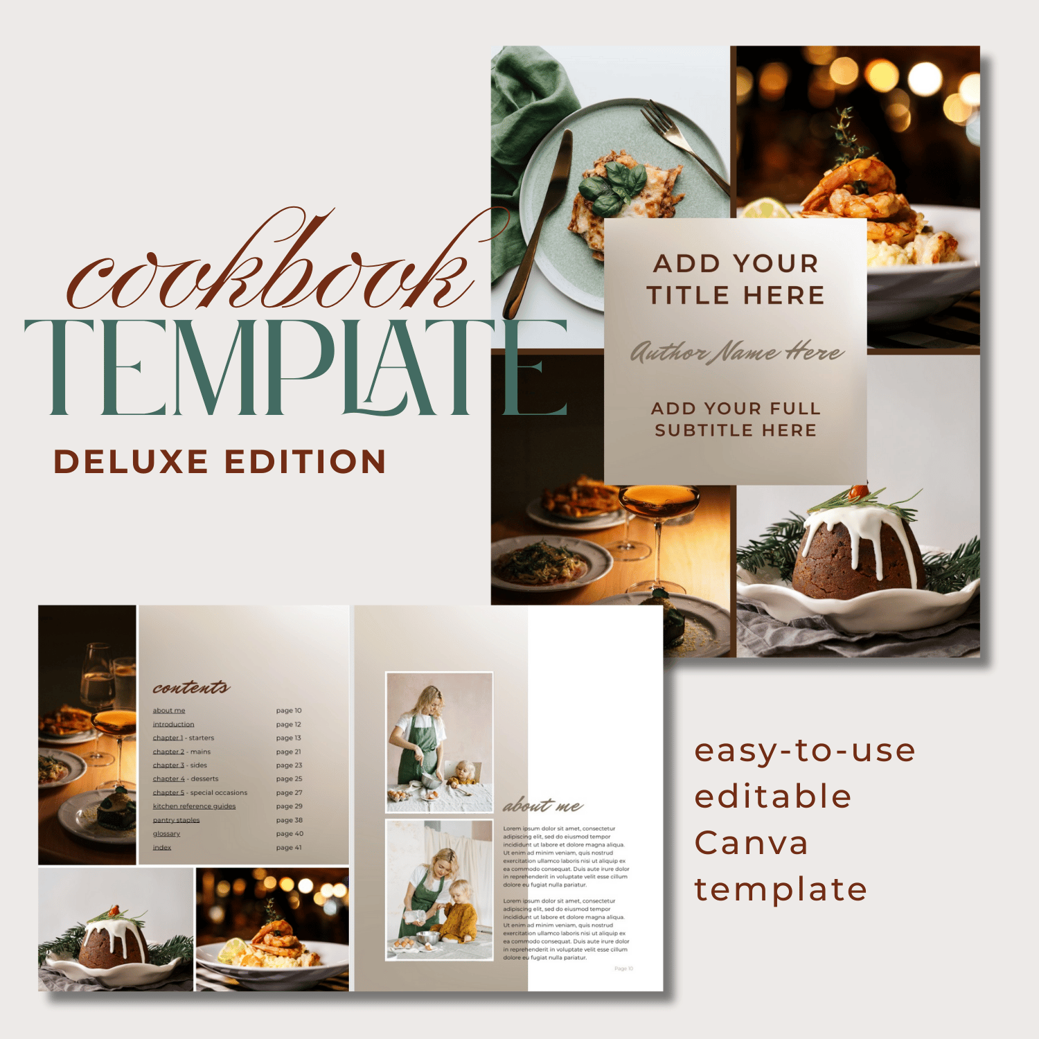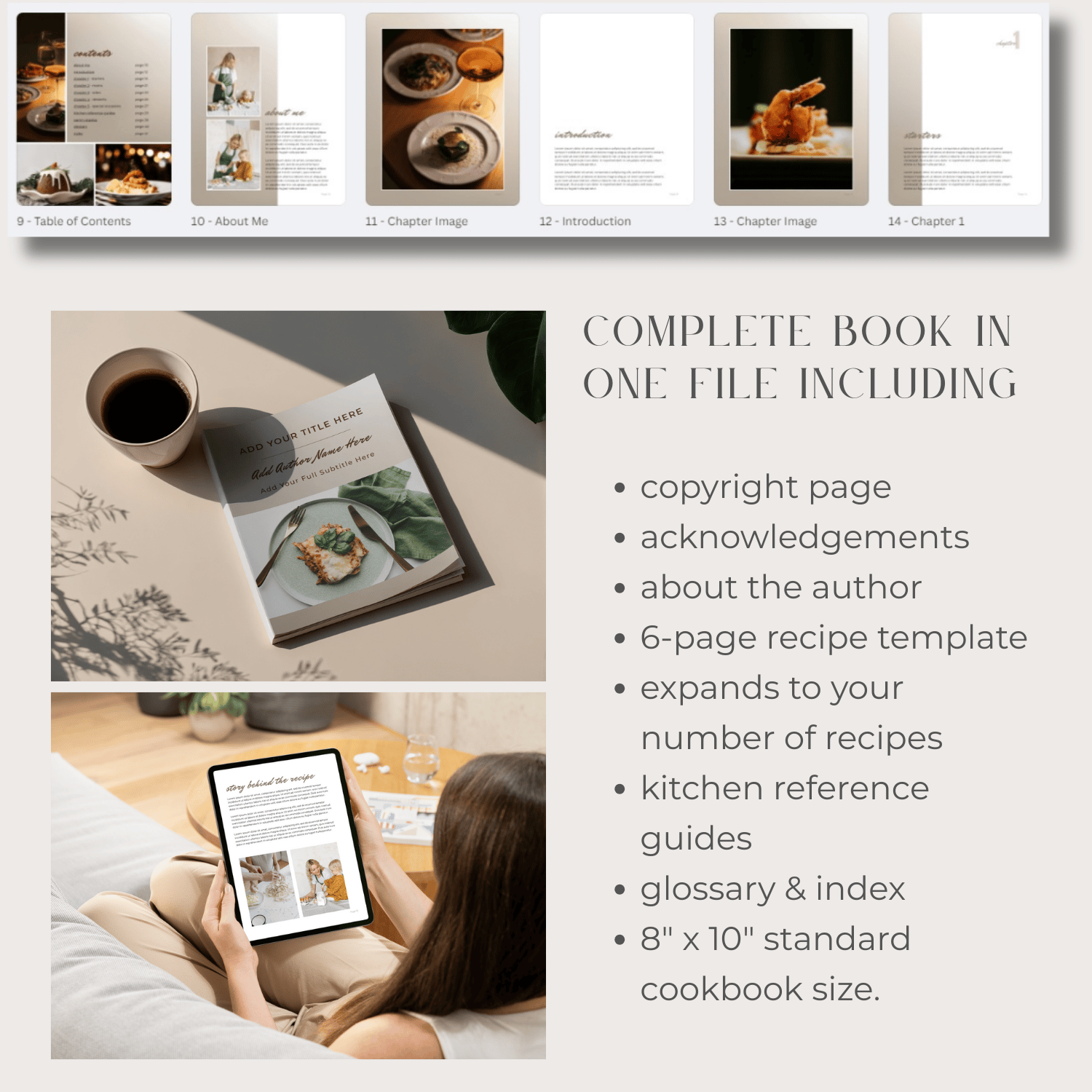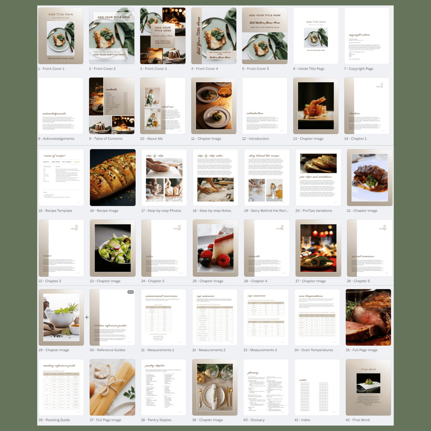 Designed for Canva free accounts - with free elements - and no extra cost for you. Sized to cookbook standard 8 x 10 in. Just add your own photos, recipes and text. Flexible format that expands to the number of recipes you want to include.