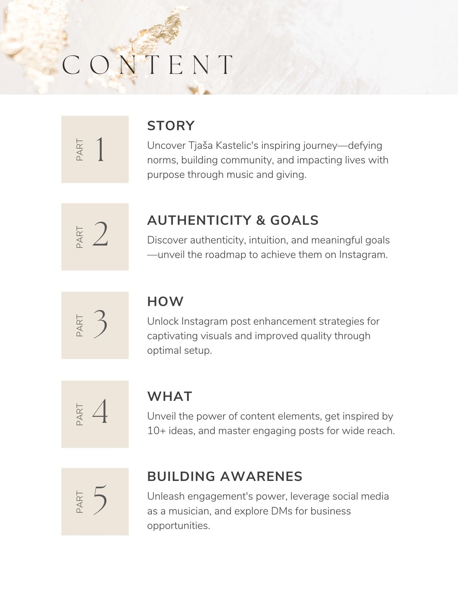 This mindset-shifting resource empowers you to overcome self-doubt and excuses, providing expert strategies, tips, and tricks based on real-life experiences. Dive deep into the art of authenticity, develop a winning mindset, and master the art of posting with step-by-step strategies. Discover a treasure trove of content ideas to keep your Instagram feed fresh and exciting.