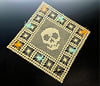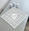 The Skull and Spider Doily blends the traditional crochet method to create the intricate frame of spiders encircling the skull, while using the filet crochet technique to create and position the skull at the centerpiece.