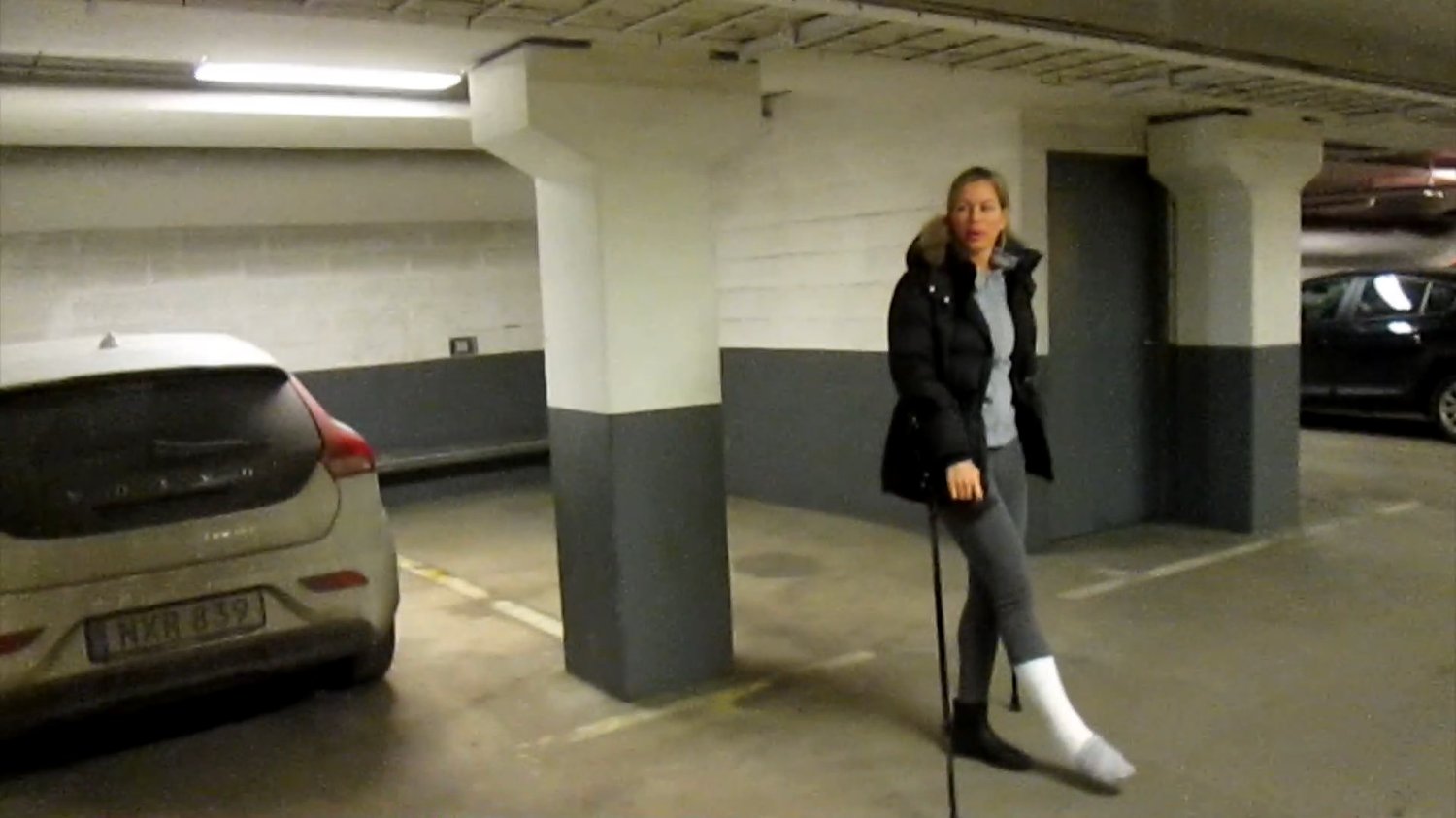 Sanne get out from the car and crutch in to a shopping center.We follow her around in the store before she take a lunch break there we can see Sanne wiggling with her toes for us even if they are protected by a sock