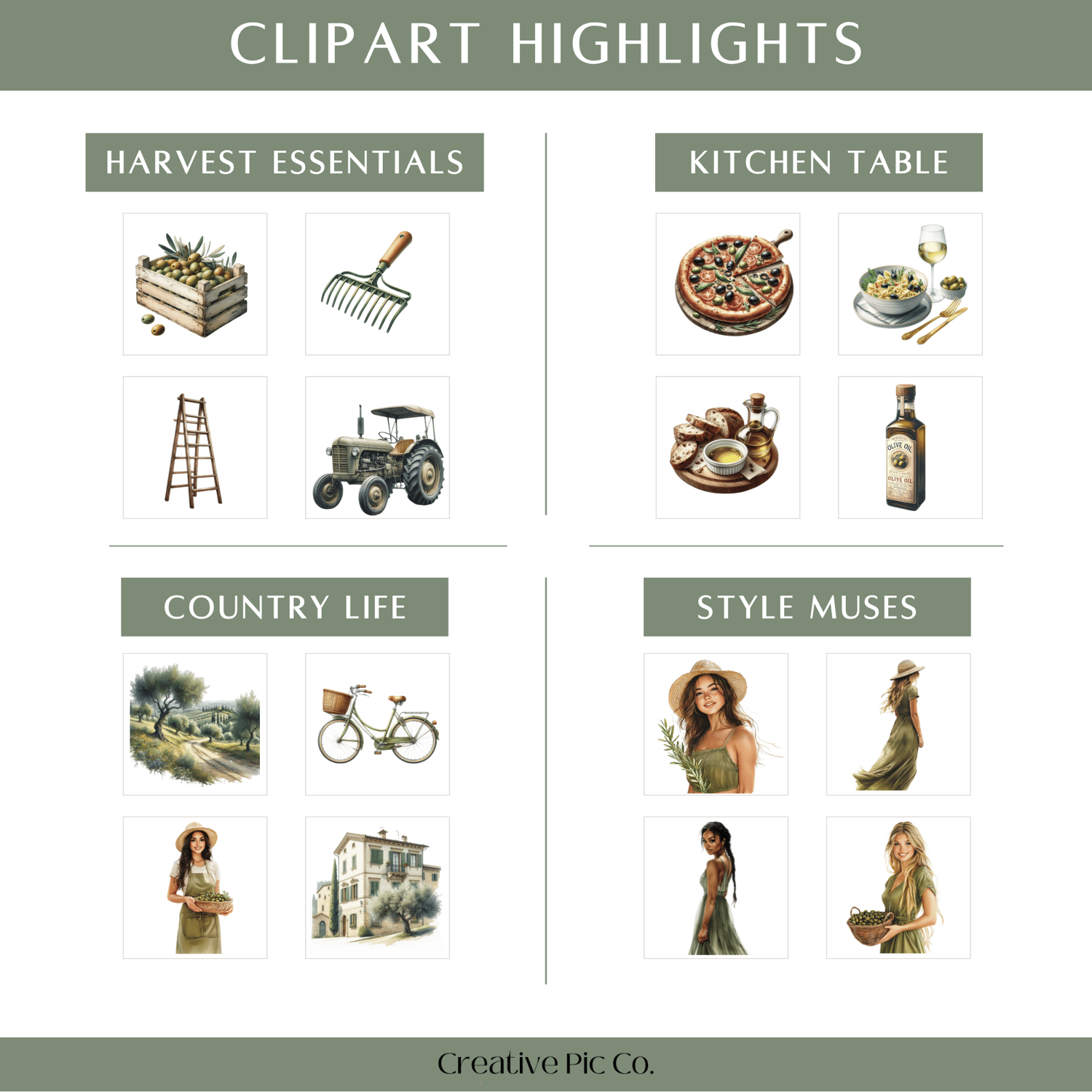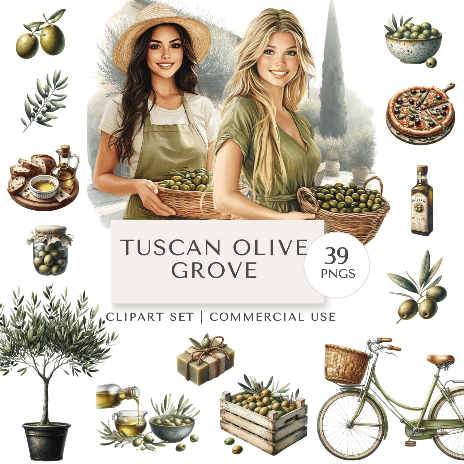 Bring the charm of the Italian countryside to your creative projects with this Tuscan Olive Grove Clipart Set. Featuring rustic textures, warm earthy tones, and handpicked details like olive branches, market produce, and effortlessly stylish women, this set evokes a slow-living Mediterranean lifestyle. Ideal for planners, branding, packaging, or anything that needs a touch of sun-drenched simplicity.