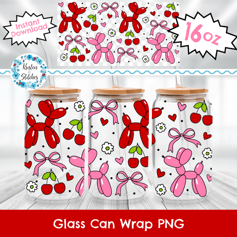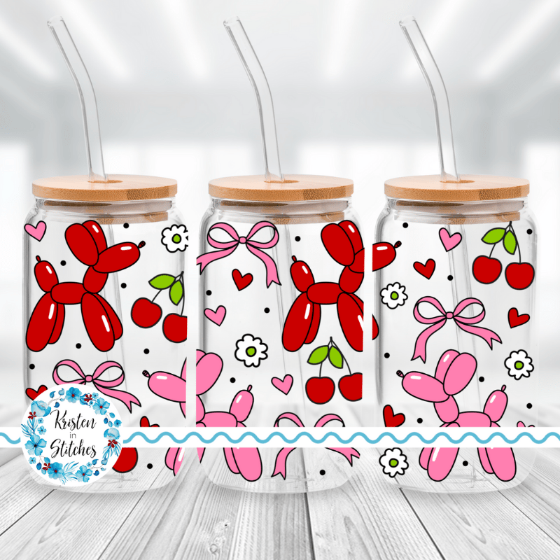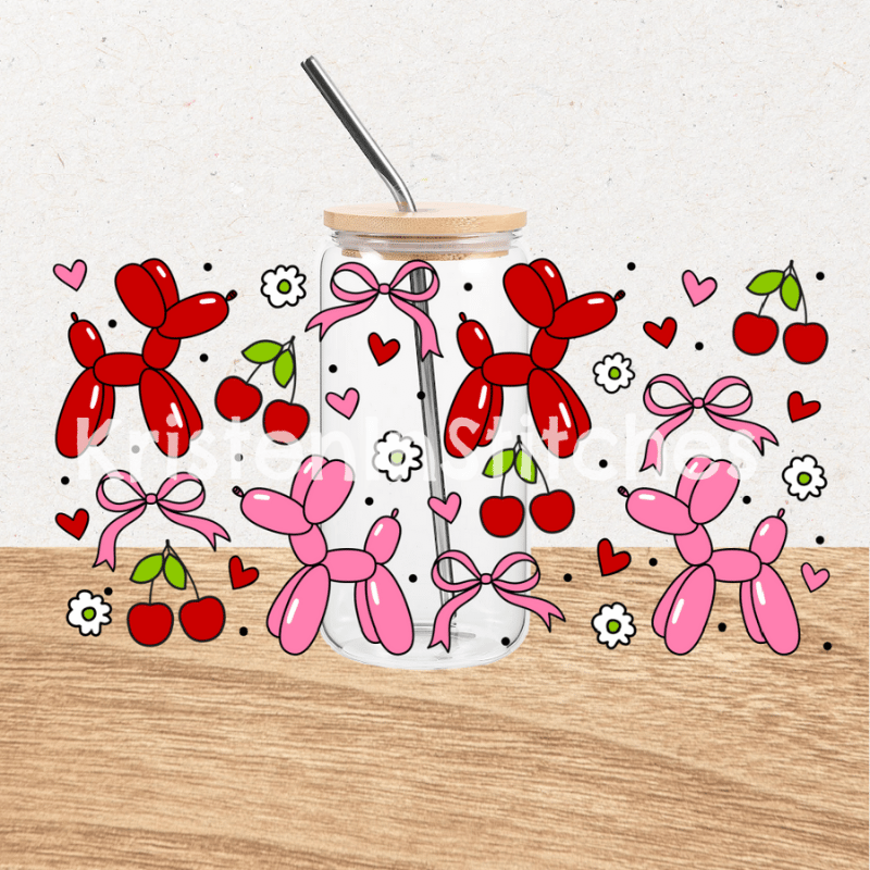 Valentine Balloon Dog Glass Can Wrap Transparent PNG, Red Hearts Coquette Bows Cherries