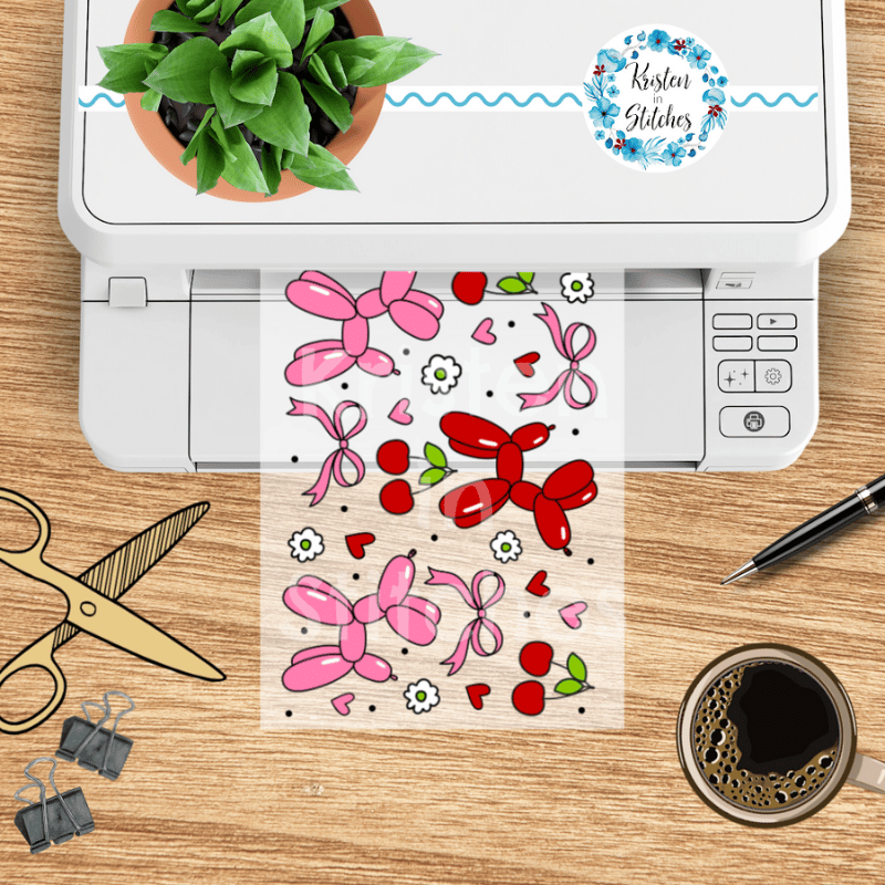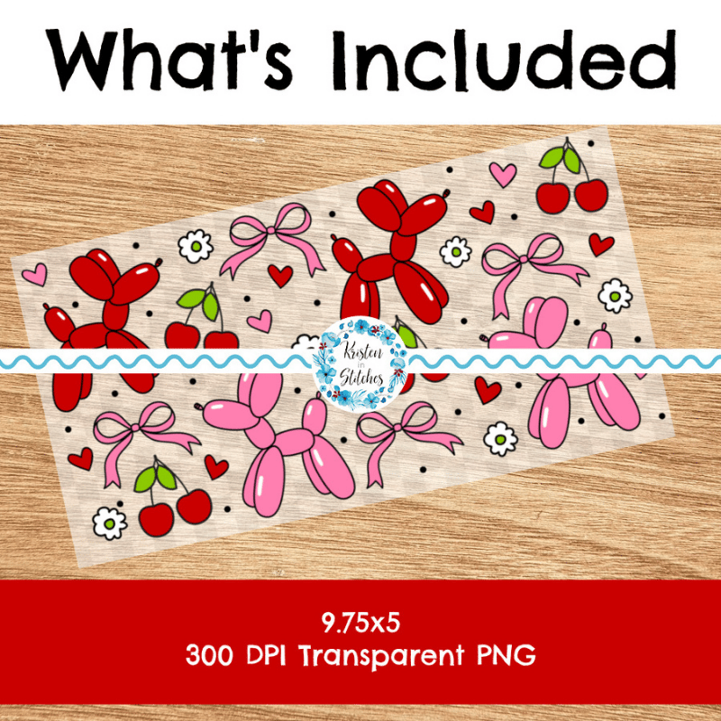 Features cute balloon animal dogs, hearts, bows and cherries.