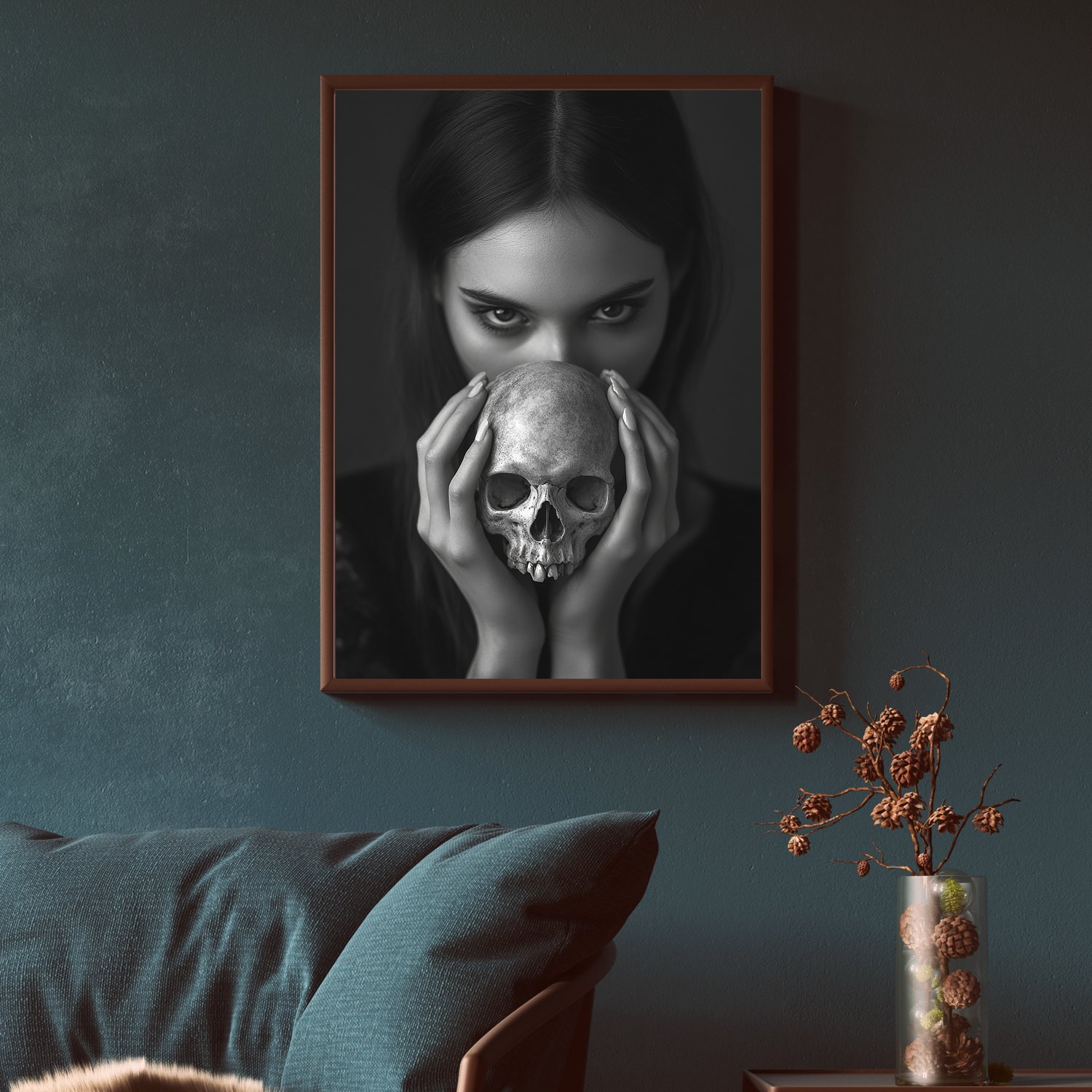 Black and White Printable Wall Art of a Girl Holding a Skull - Add a striking, contemporary edge to your home decor with this powerful black-and-white photograph. Featuring a young woman holding a skull, this piece brings a touch of mystery and sophistication, perfect for modern, minimalist interiors. Ideal for a unique gallery wall, bedroom, or living space, this high-resolution digital download is ready to print and frame, allowing you to bring bold, artistic flair to any room with ease