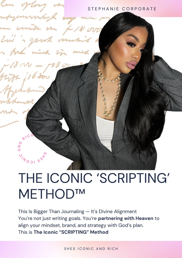 The Scripting Journal for She’s Iconic & Rich is designed as a sacred tool to Biblically anchor, script, and pray. Whenever I enter into my appointments with God, I discipline myself to transcribe every thought, affirmation, and manifestation. I refuse to neglect a single day, for scripting has become the very compass that keeps me aligned, balanced, and purpose-driven. This sacred practice has not merely shifted my habits—it has revolutionized my entire existence. Out of this transformation, I have cultivated both a devotional and a journal, so that women and men alike can script their journeys while communing with Jesus in intentional, divine dialogue.
