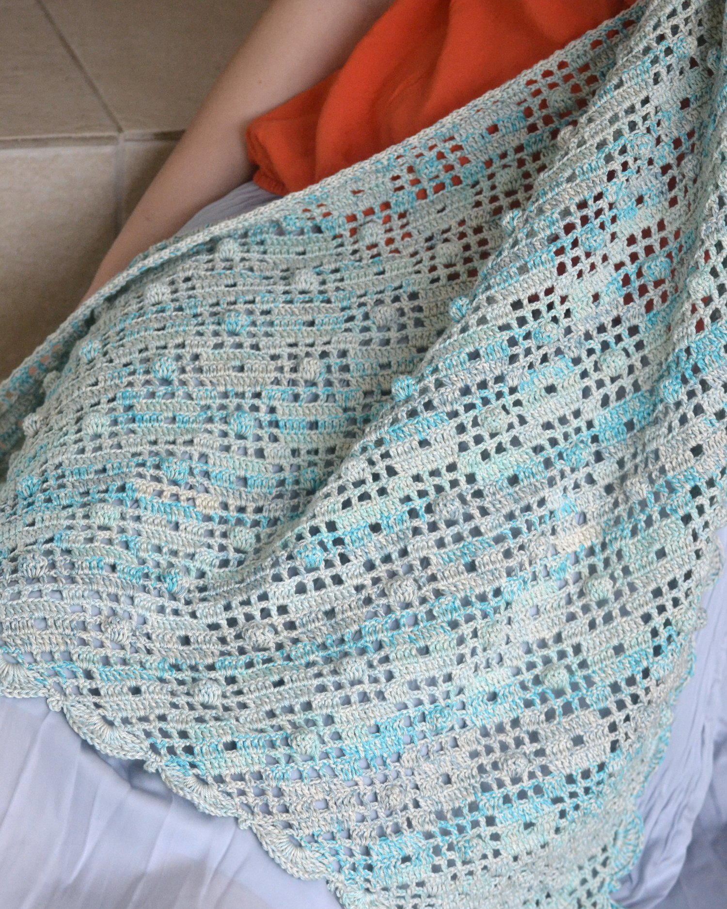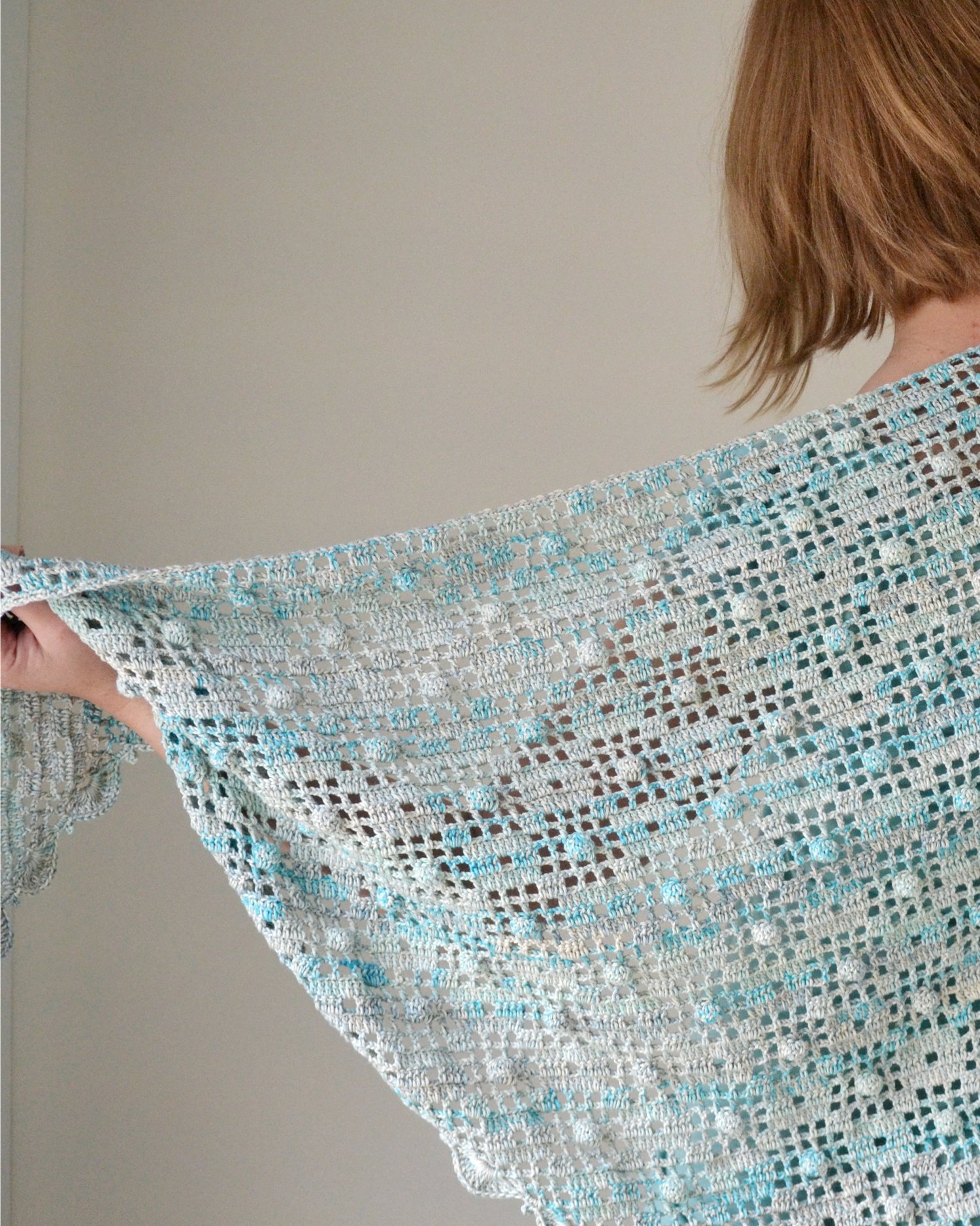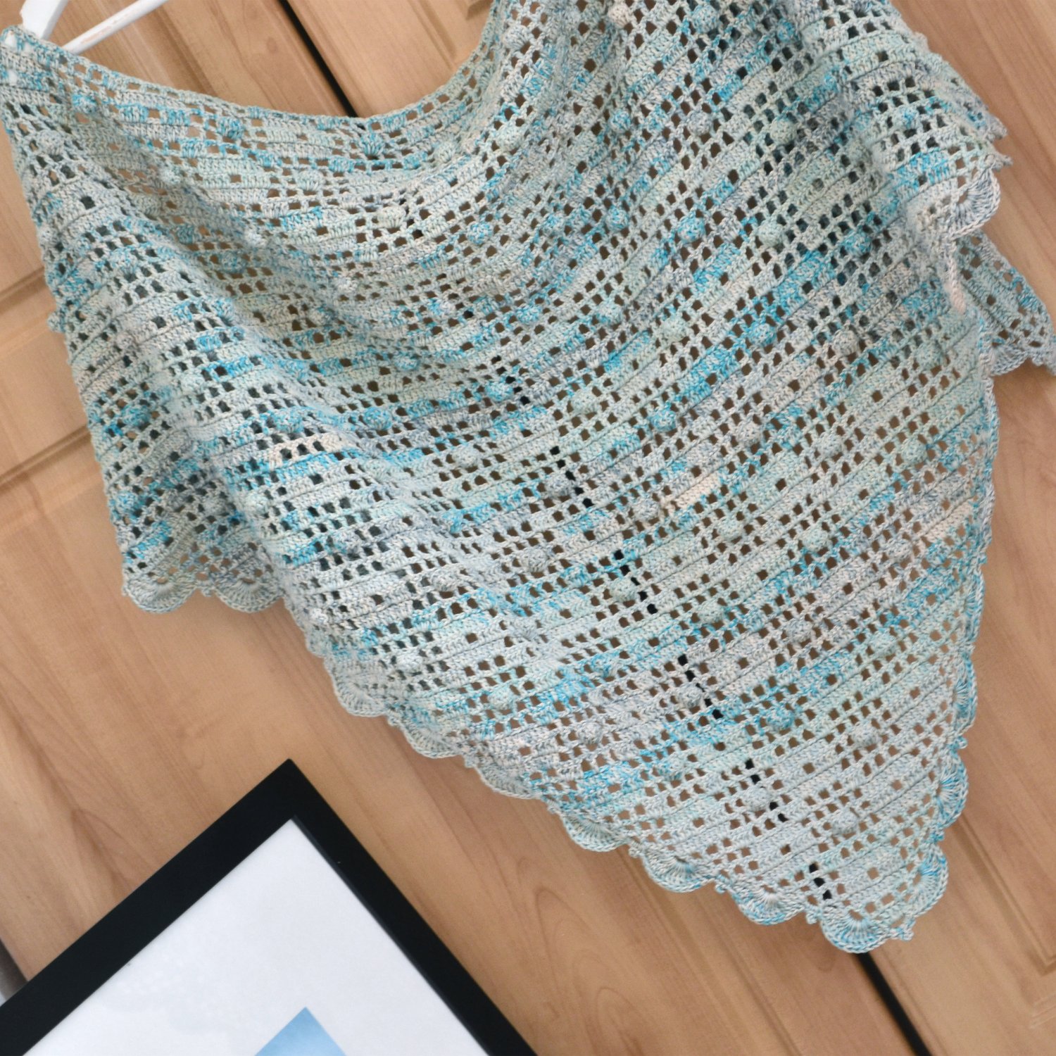 Ice Bubble is a light and breezy triangular shawl worked in a playful filet crochet pattern, perfect for summer days and easy, meditative stitching. The stitch motif features soft circular shapes filled with tiny bobbles, a subtle nod to round ice cubes swirling in a refreshing drink.