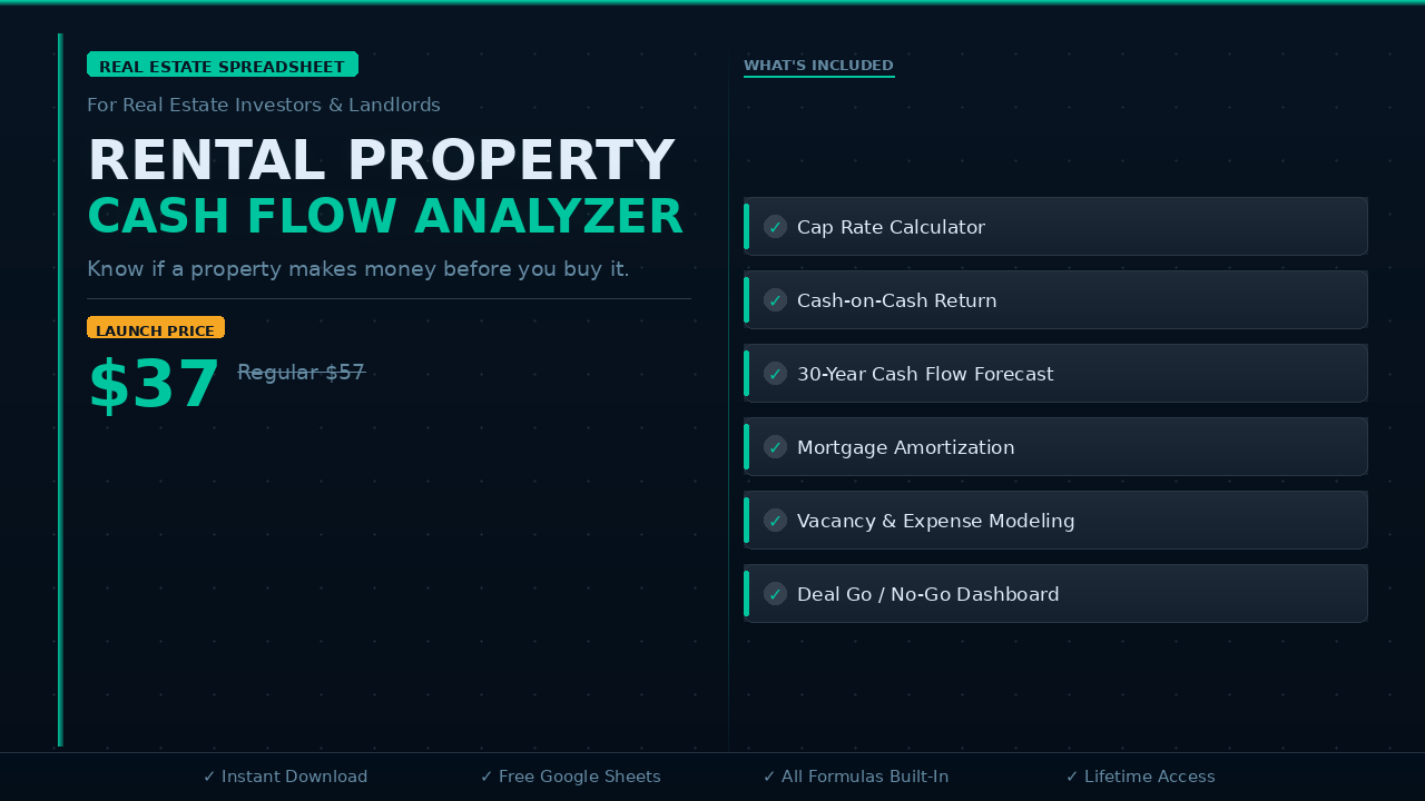 This Google/Excel Sheets template gives you a complete financial picture of any rental property in under 5 minutes — cap rate, cash-on-cash return, 30-year cash flow forecast, and a clear Go/No-Go verdict — all automated. No finance degree. No expensive software. Just open, enter your numbers, and let the spreadsheet do the work.