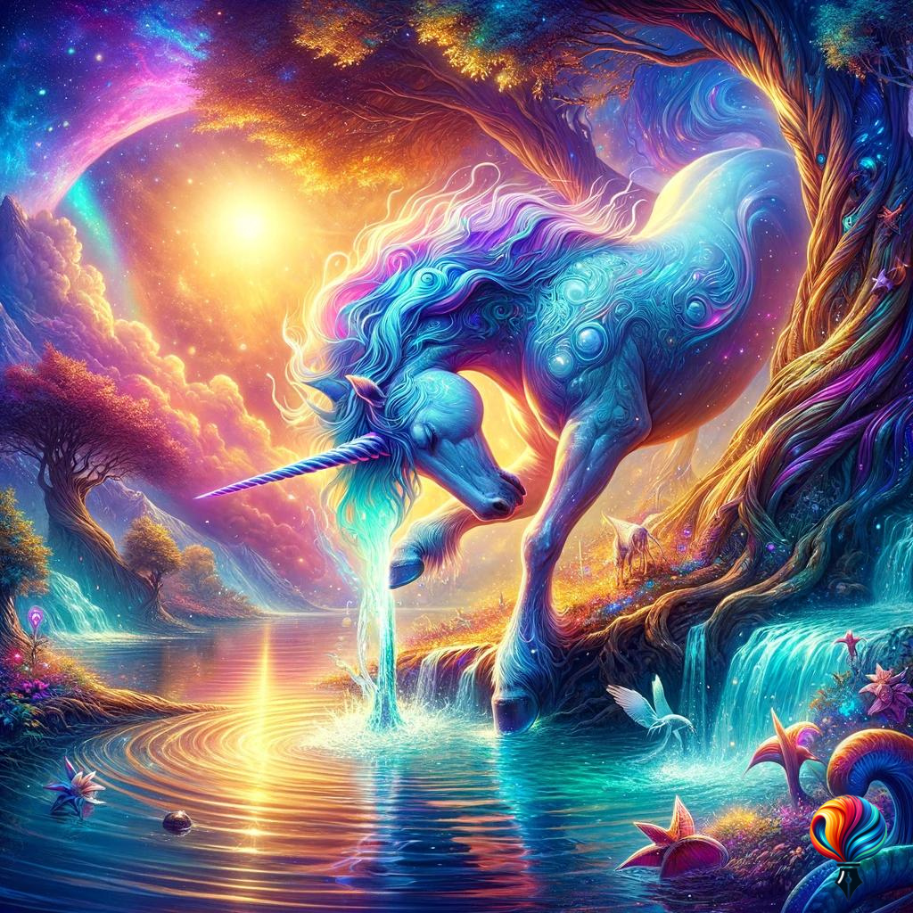 Introducing "Greater Restoration," a mesmerizing unicorn art print that transports you to a magical and vibrant landscape. This enchanting artwork features a majestic unicorn standing by the edge of a serene river, its horn glowing with a radiant light. As the unicorn dips its horn into the water, the once murky river becomes crystal clear, instantly purifying and restoring life to the surrounding ecosystem. Lush greenery, blooming flowers, and vibrant wildlife emerge, thriving in the rejuvenated environment. Perfect for unicorn lovers and fantasy art enthusiasts, this high-quality print infuses any space with a sense of wonder and mystical beauty.