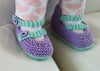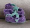 These 8ply garter stitch shoes are knitted in two colours, and have a high back and two buttoned straps.