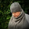 The scarf is a beautifully relaxing knit with simple combinations of knit, purl and comma stitch. The beanie, which is knitted in the round, has a simple ribbed band, carries on the comma stitch motif and has a simple, but tidy crown. Both are satisfying projects for knitters of all abilities and relatively quick to knit too due to using aran yarn and 6mm needles.