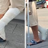 Later we see him again coming out of the hospital. The split fiber SLC has changed to a clean white fiber SLC. He still has to use crutches. As he waits for his father to pick him up with the car, we can enjoy his right casted foot for a few minutes before he moves into the car.