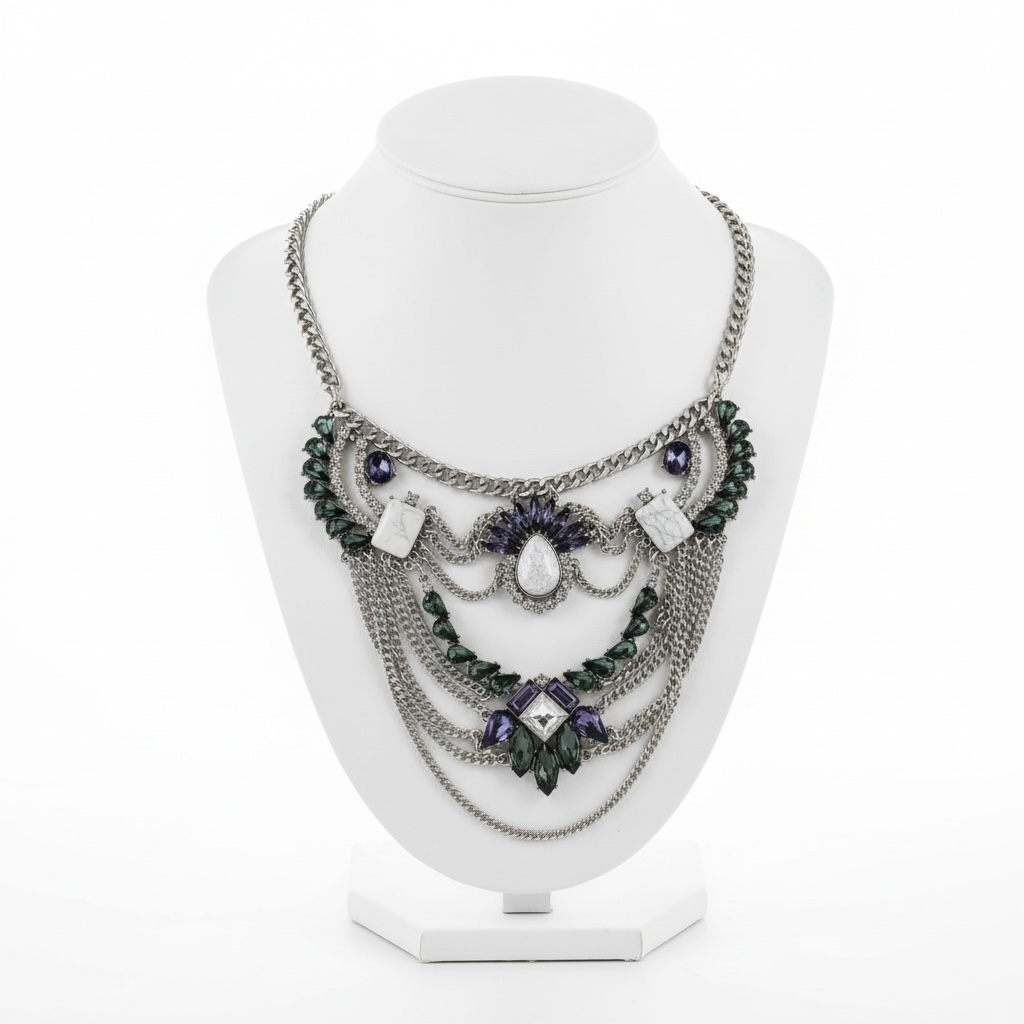 This bold statement necklace features a dramatic multi-layered design with cascading gunmetal-tone chains and faceted crystal accents. The centerpiece showcases a teardrop crystal framed by pavé detailing, complemented by deep violet stones for a striking contrast. Designed to sit beautifully at the neckline, this piece instantly elevates both casual and evening looks.
