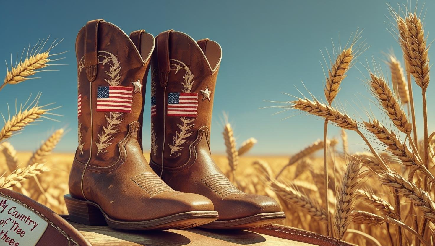 My Country ‘Tis Of Thee Cowboy boot desktop PNG featuring an Americana wheat field and spacious sky. 🤠🇺🇸