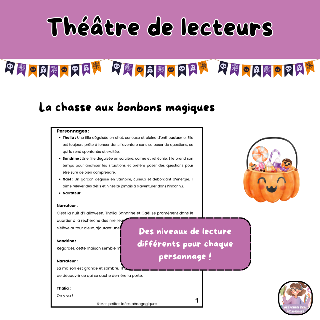 Ce théâtre de lecteurs permet aux élèves de 2e cycle de participer activement à la lecture, en alternant les rôles entre les personnages. C’est un contexte concret et ludique pour travailler la fluidité en lecture. Le document peut être utilisé avec des élèves de niveaux scolaires variés selon leur habileté en lecture et en fonction de l’intention pédagogique recherchée. Ce matériel peut donc être utilisé dans divers contextes (classe, orthopédagogie). Vous trouverez une histoire sous le thème l’Halloween et comprenant trois personnages ainsi qu’un narrateur.