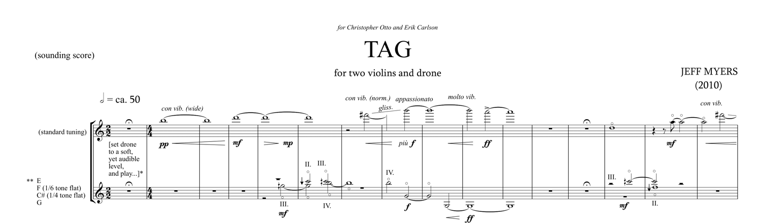 TAG for two violins and electronic drone - Full Score PDF and drone (transposed and concert score)