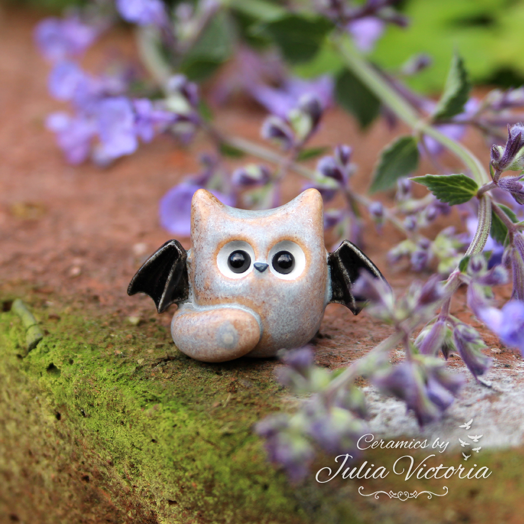 These cute little cats with bat wings are looking for a new home. They are hand-sculpted in ceramics, glazed and painted by me