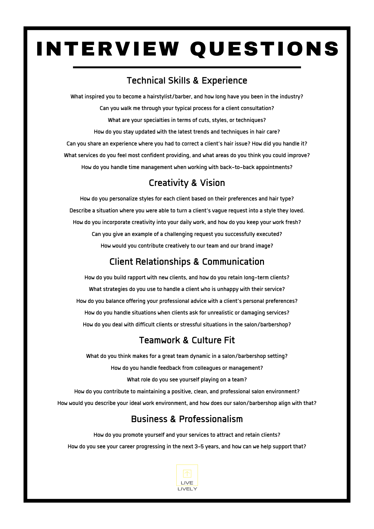 Live Lively wants to support you in hiring your next creative professional. We have curated a list of questions you should ask your next potential employee. There are the need to knows and there are some that help you understand even further if this is the creative space you belong in.