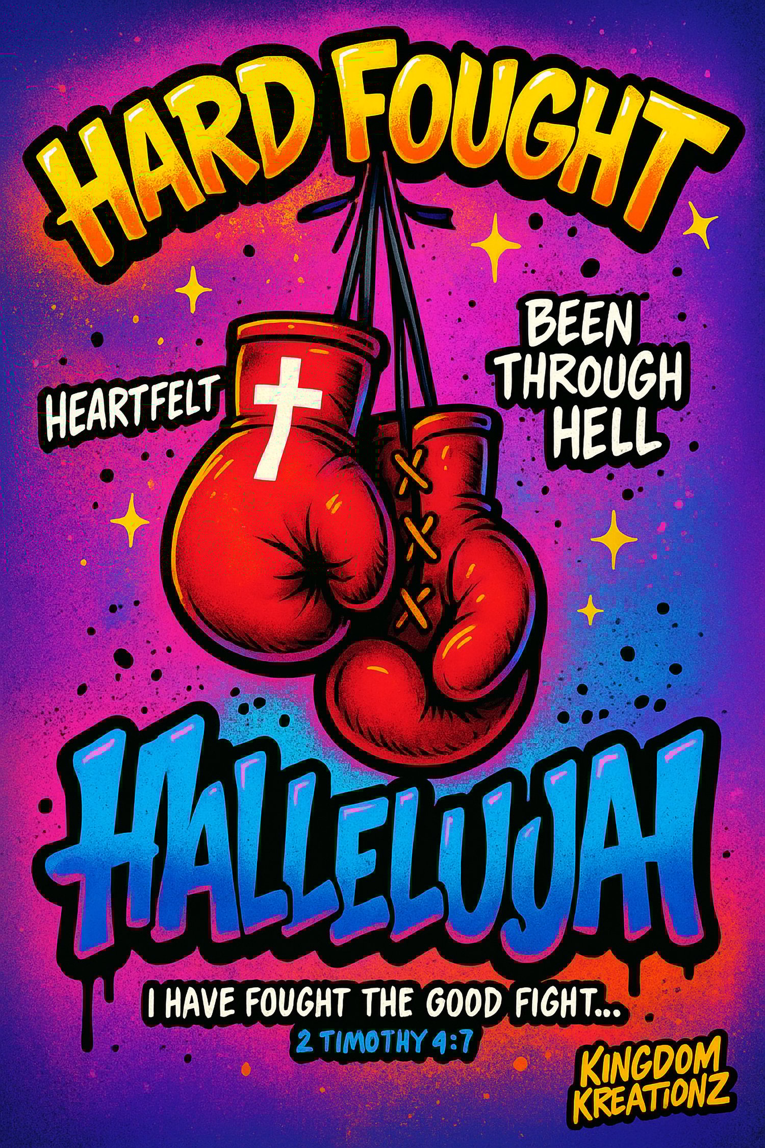 Bring powerful testimony to your digital collection with the “Hard Fought Hallelujah” boxing gloves design. This bold, graffiti-style PNG features heartfelt faith imagery with red gloves, a cross, and a message that speaks survival, struggle, and praise: “Been Through Hell – Heartfelt – Hard Fought.”