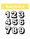 - Numbers Section: Numbers 1 through 9 are presented with their corresponding number words and illustrations of the quantity (e.g., "1 One Flower," "2 Two Lollipops," etc.).