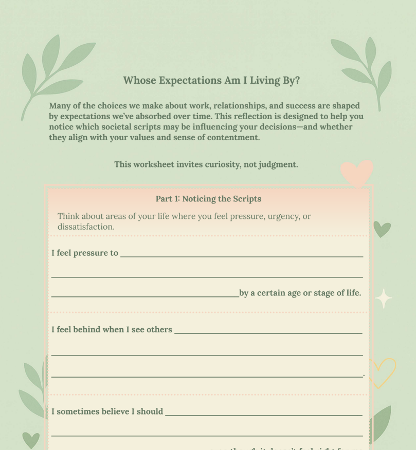 Whose Expectations Am I Living By? is a thoughtfully designed, 7-page guided reflection that helps you notice which societal scripts are influencing your decisions—and whether they truly align with your values, well-being, and sense of contentment.