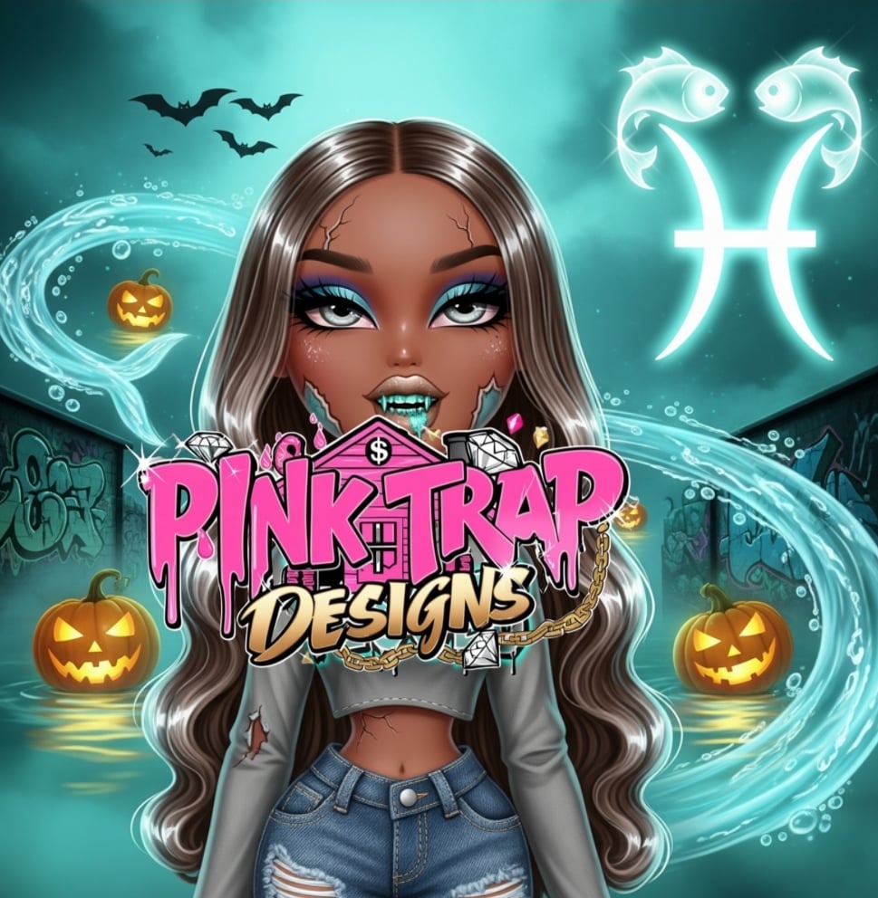 This collection features 12 hyper-realistic chibi doll-style PNG illustrations, each inspired by the zodiac signs with a unique Halloween urban twist. The characters are designed in a Bratz-inspired glam aesthetic (without branding), with bold almond-shaped eyes, glossy lips, and doll-like proportions. Each sign has its own themed outfit, urban streetwear vibe, and color palette based on its astrological element (Fire, Earth, Air, Water).