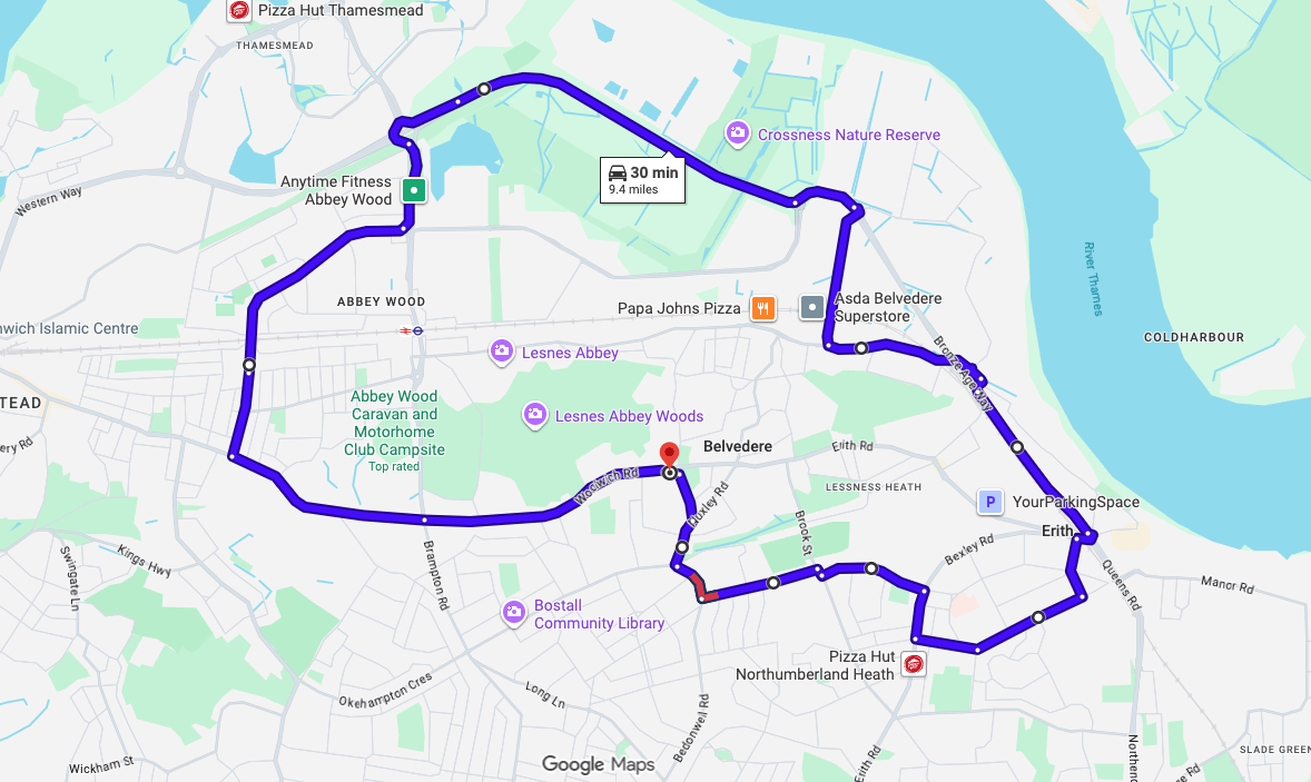 Practise real driving test routes in Belvedere (London) before your exam – open directly in Google Maps