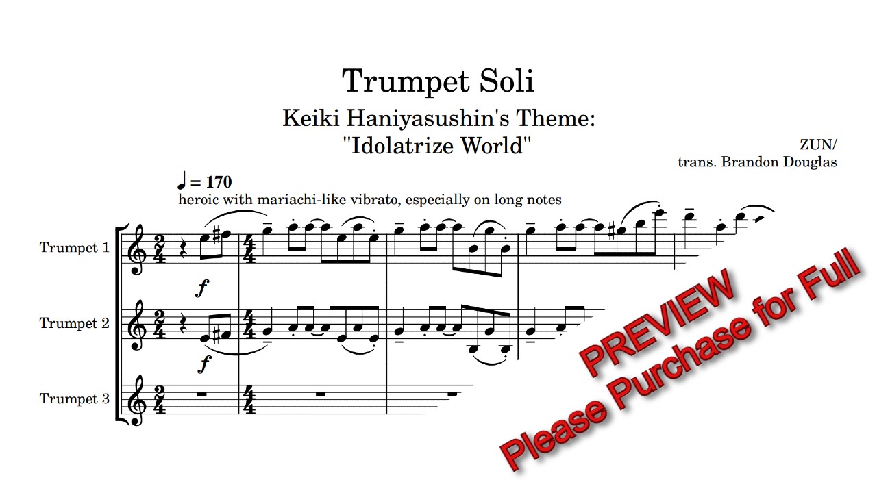 Trumpet Soli from TouHou 17, Keiki Haniyasushin's theme, "Idolatrize World" for 3 trumpets