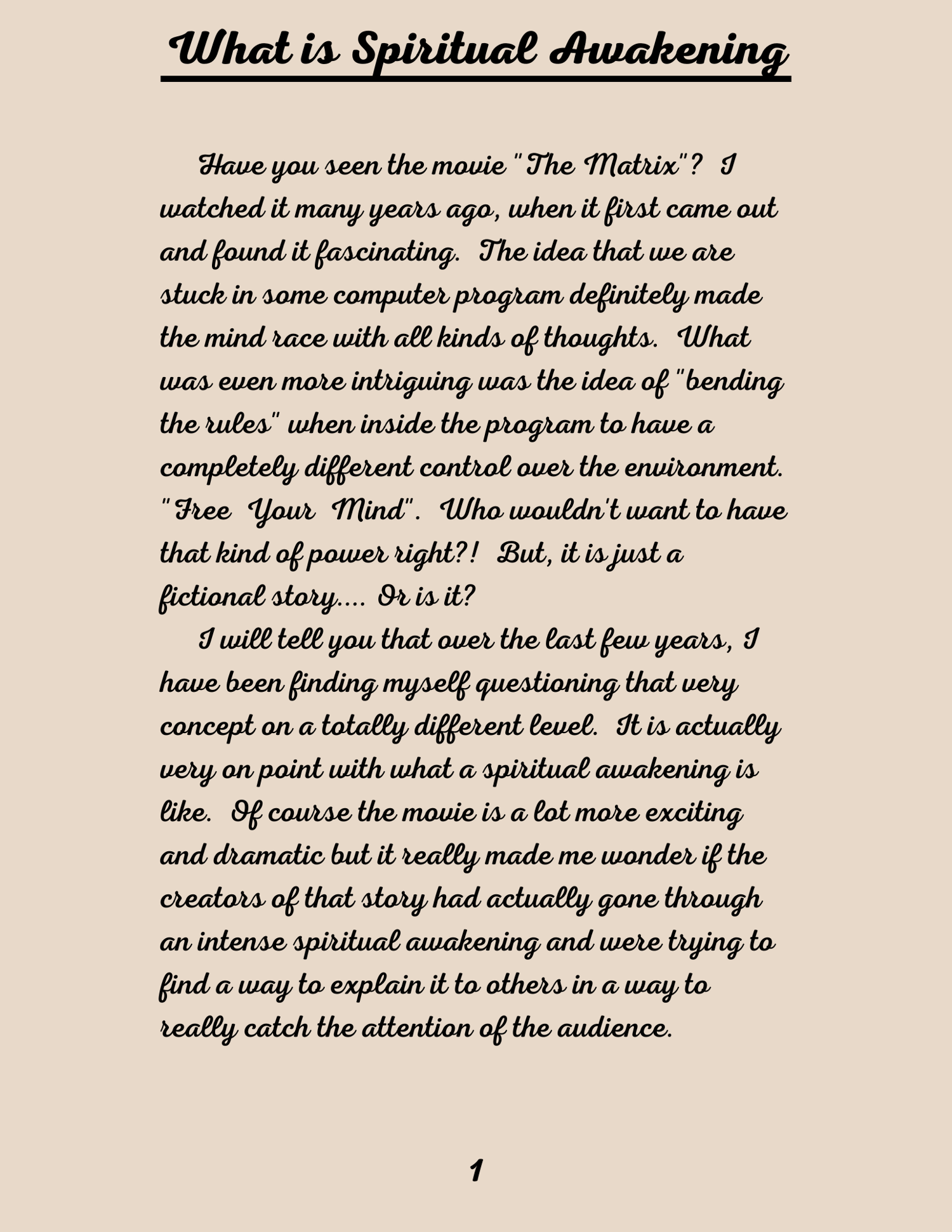In this 33 page ebook, I will guide you through the first steps of your spiritual awakening as I have experienced it. Taking everything I have learned and experienced through numerous books, videos and conversations, I have compiled all of it (so far) into an easy to understand and straight forward format. This journey can be confusing and frustrating at times but just know that you are not alone.