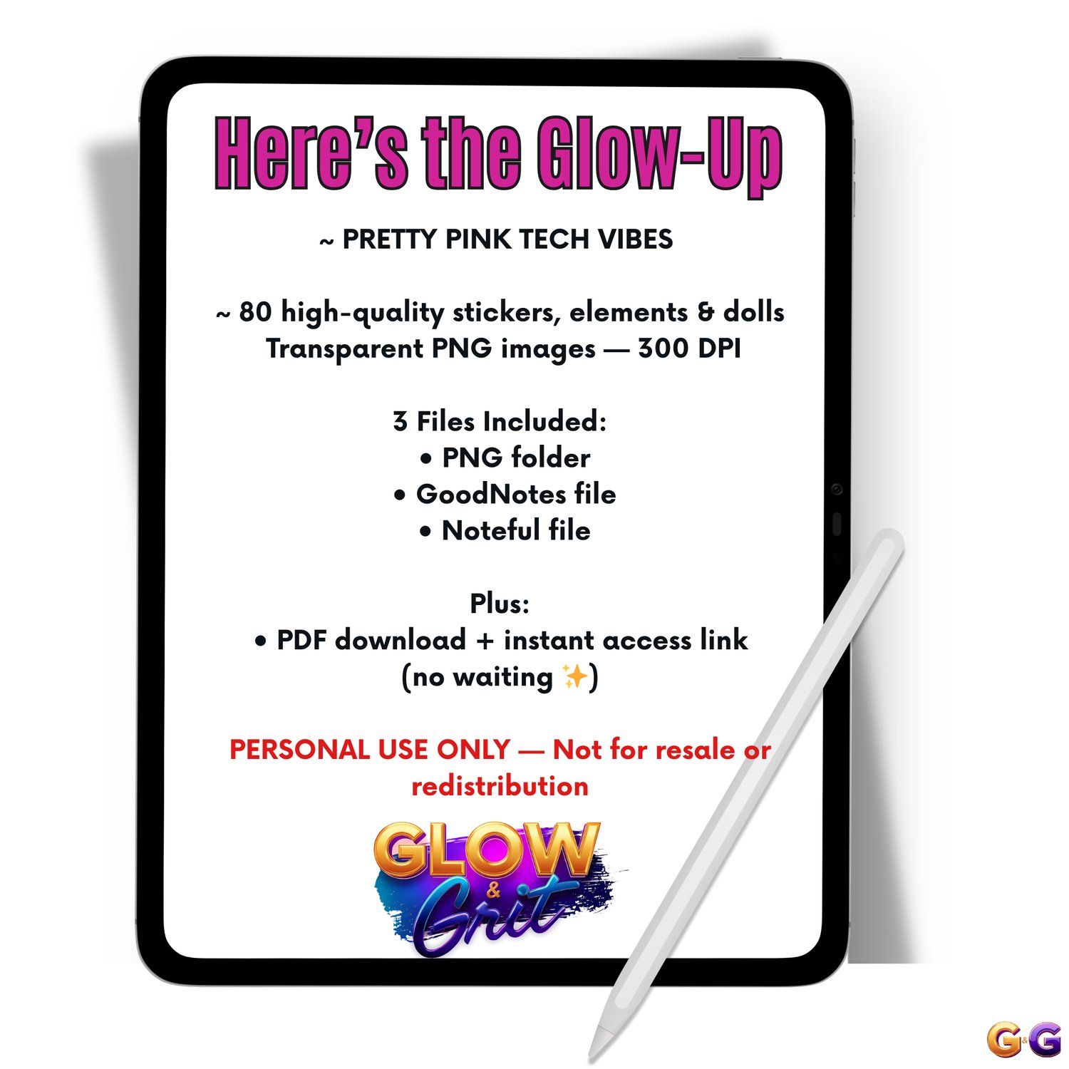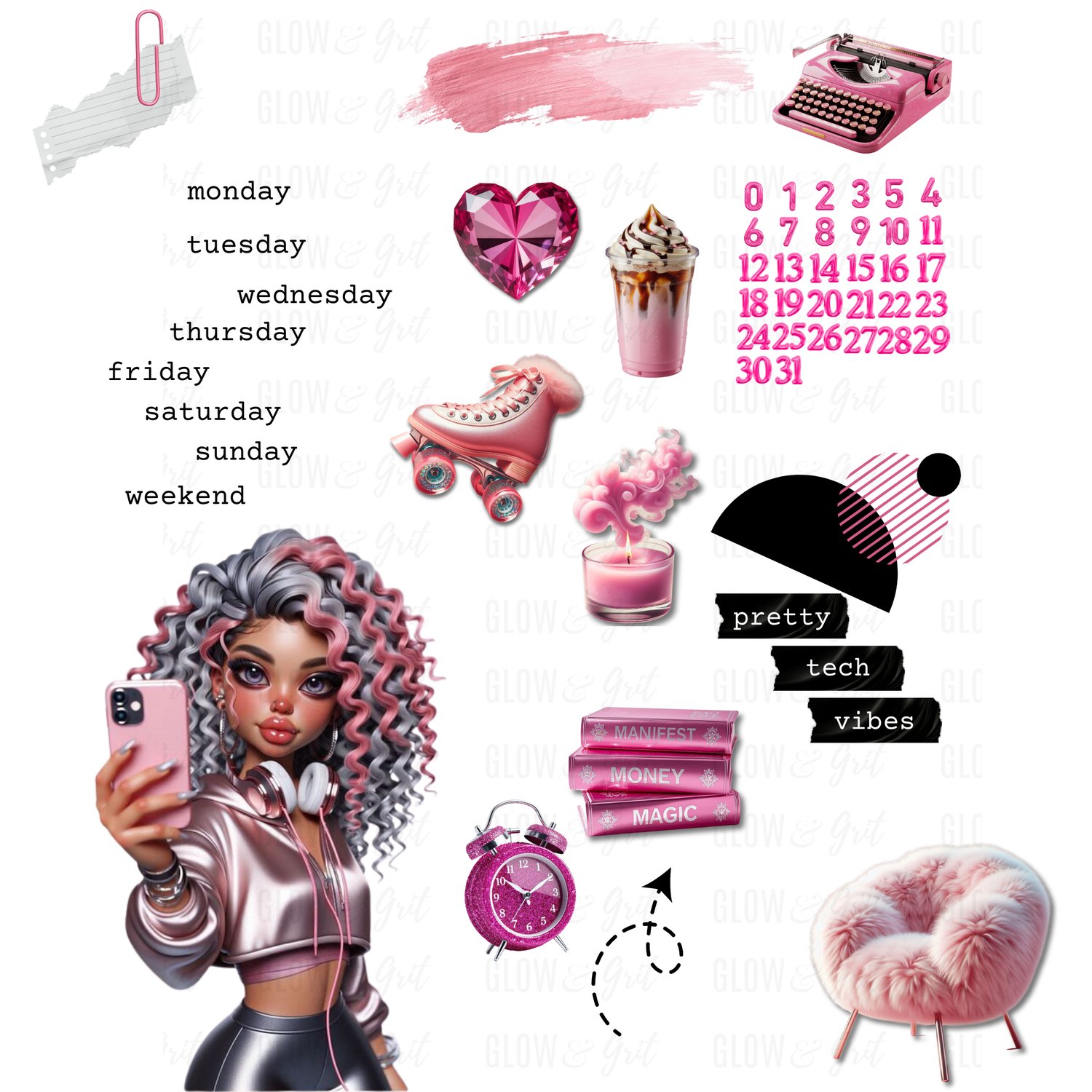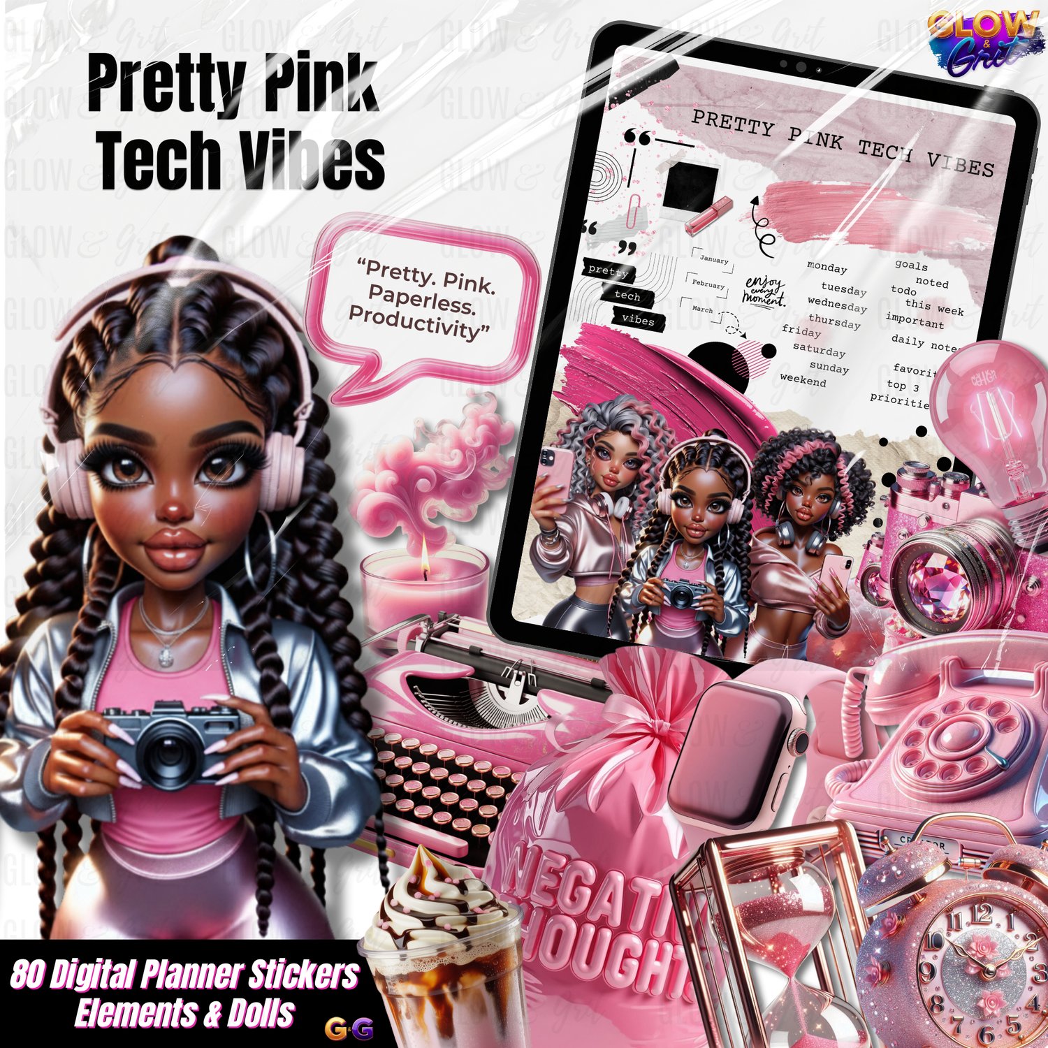 Bring bold pink energy, glossy luxury elements, and three stunning G&G dolls into your planner spreads with the Pretty Pink Tech Vibes Sticker Pack. Designed for GoodNotes + Noteful, these chic collage-style stickers blend productivity, creativity, and aesthetic tech vibes with the signature Glow & Grit look.