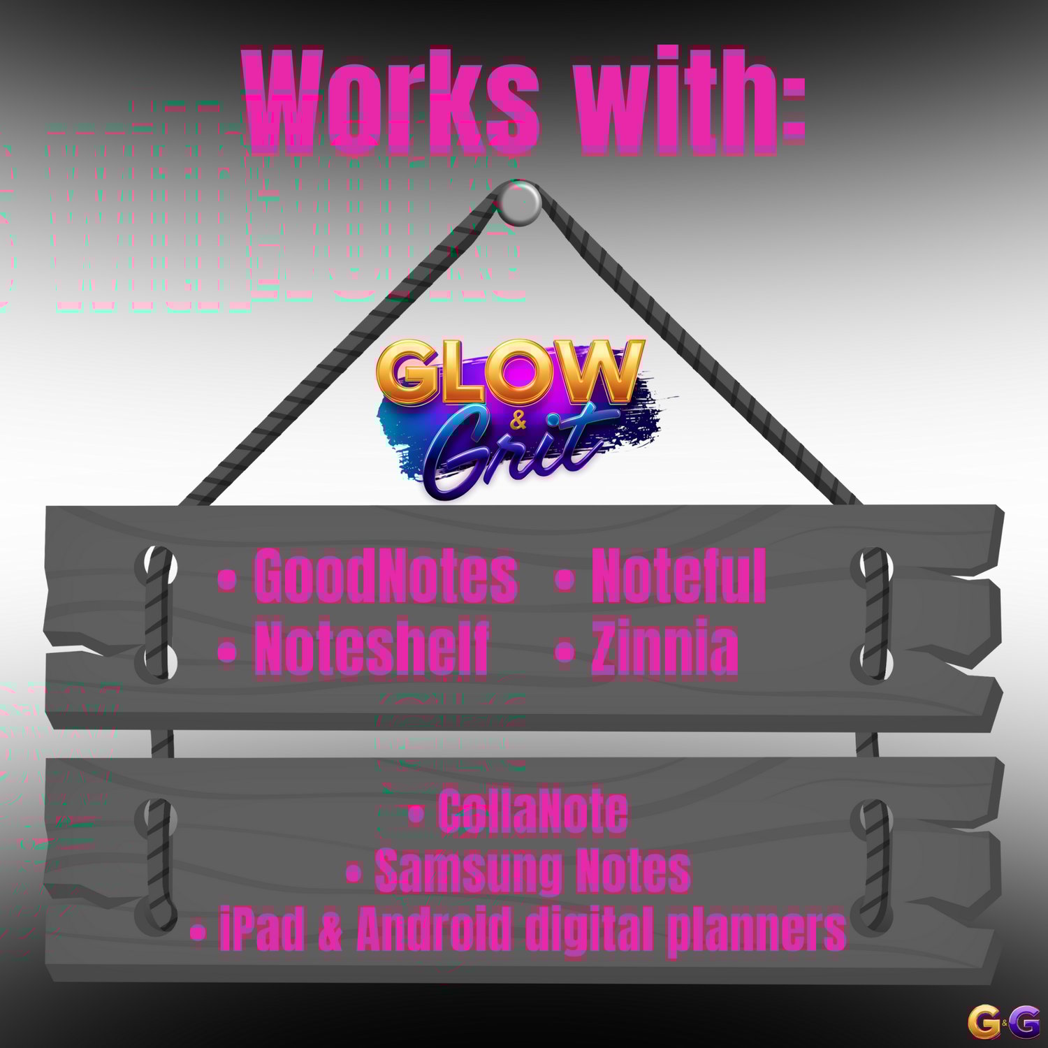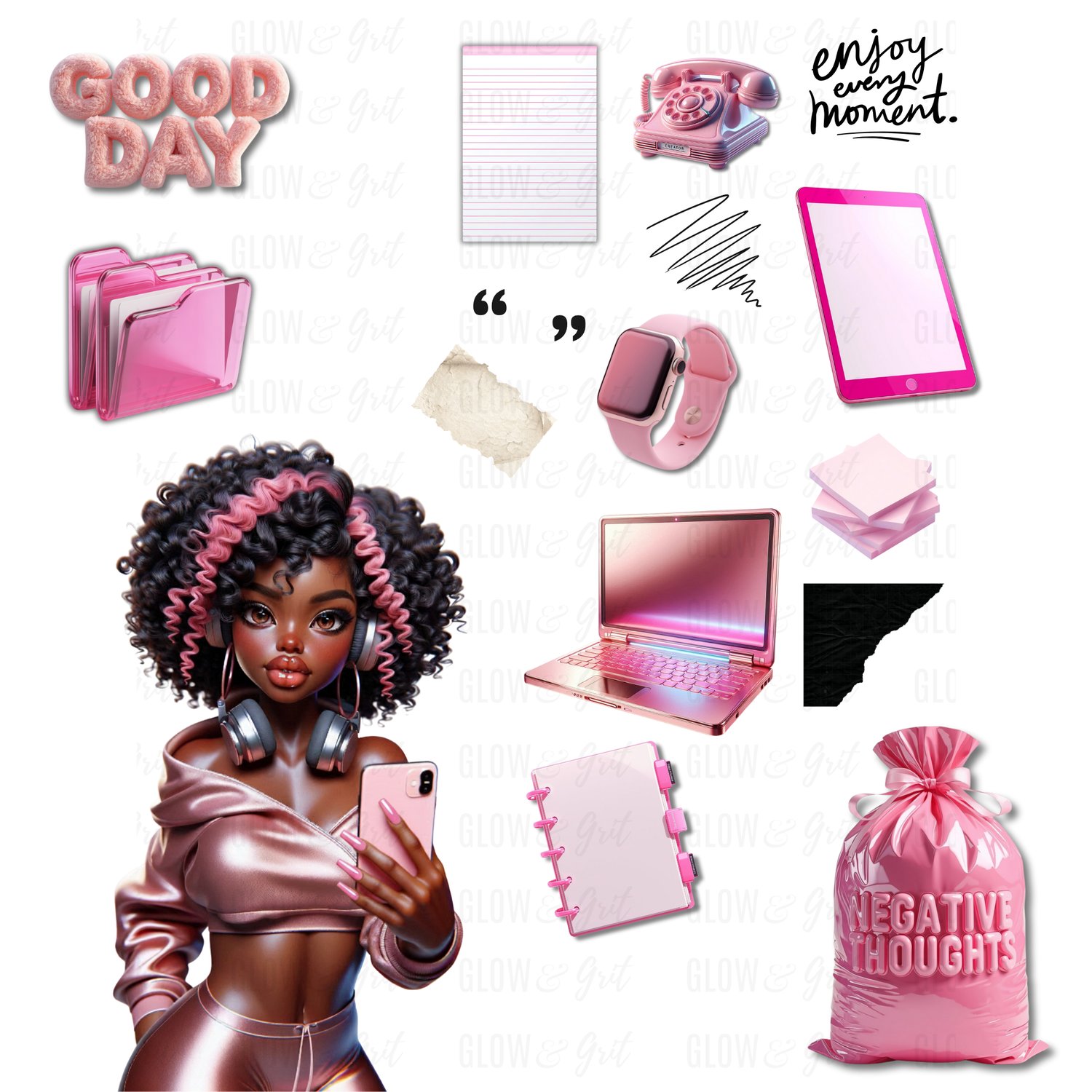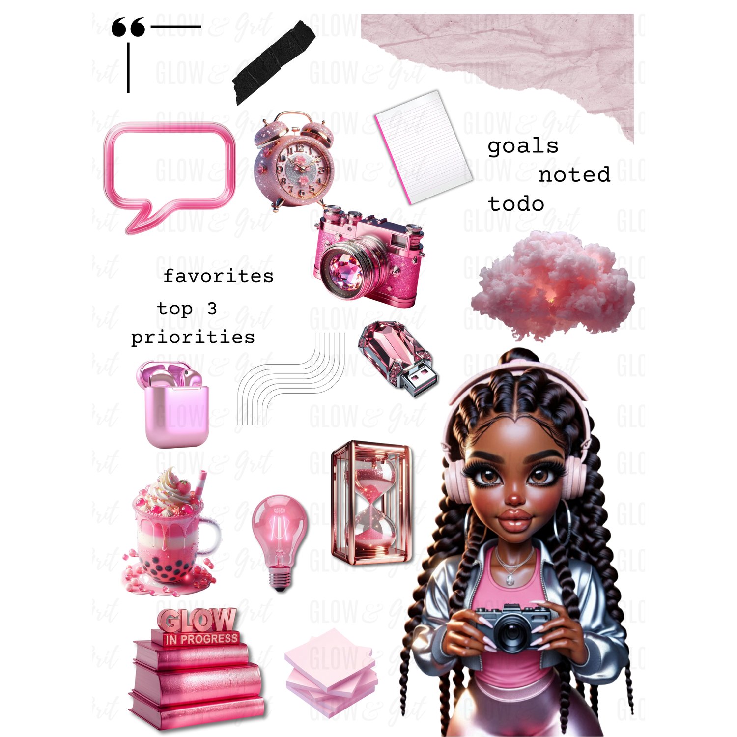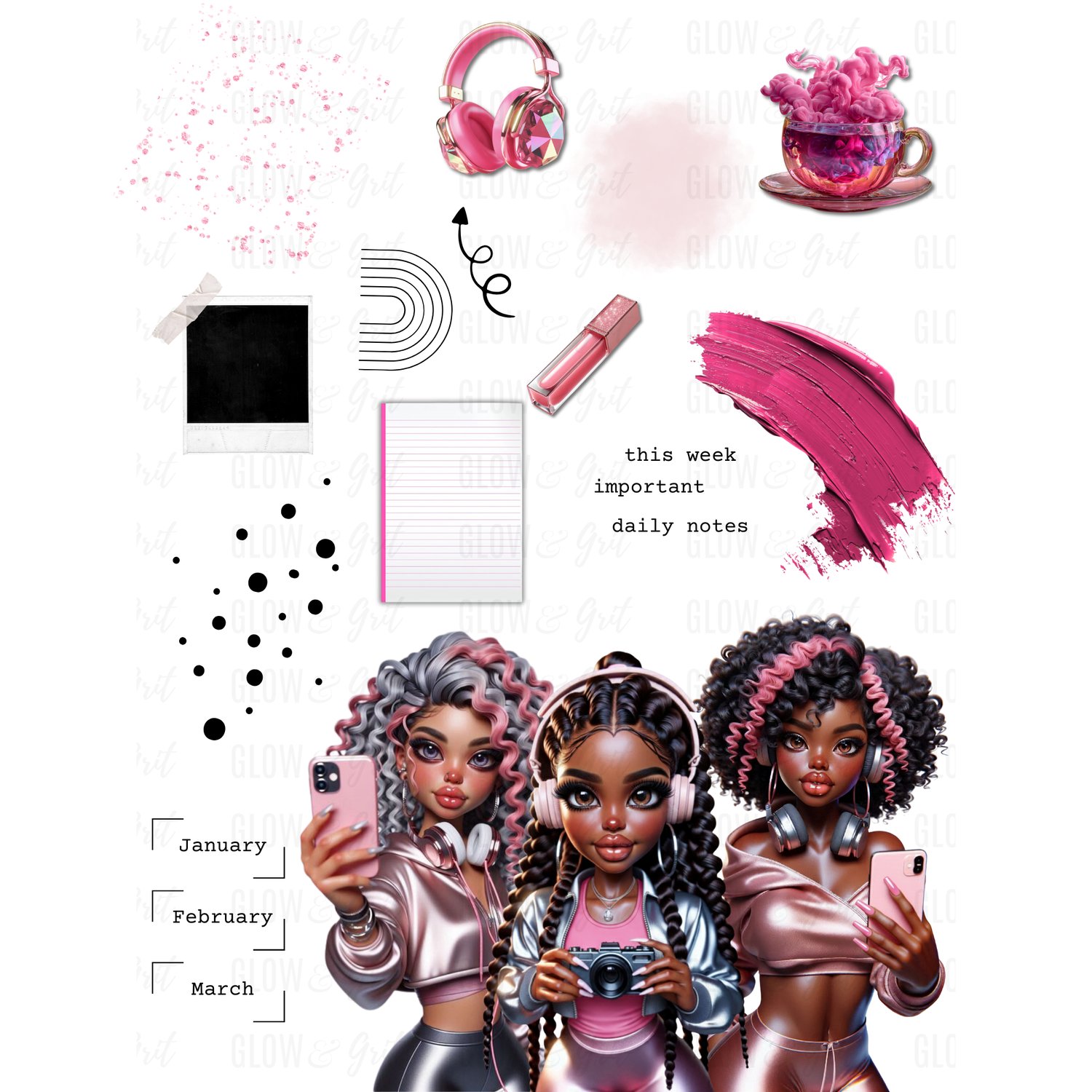 Bring bold pink energy, glossy luxury elements, and three stunning G&G dolls into your planner spreads with the Pretty Pink Tech Vibes Sticker Pack. Designed for GoodNotes + Noteful, these chic collage-style stickers blend productivity, creativity, and aesthetic tech vibes with the signature Glow & Grit look.