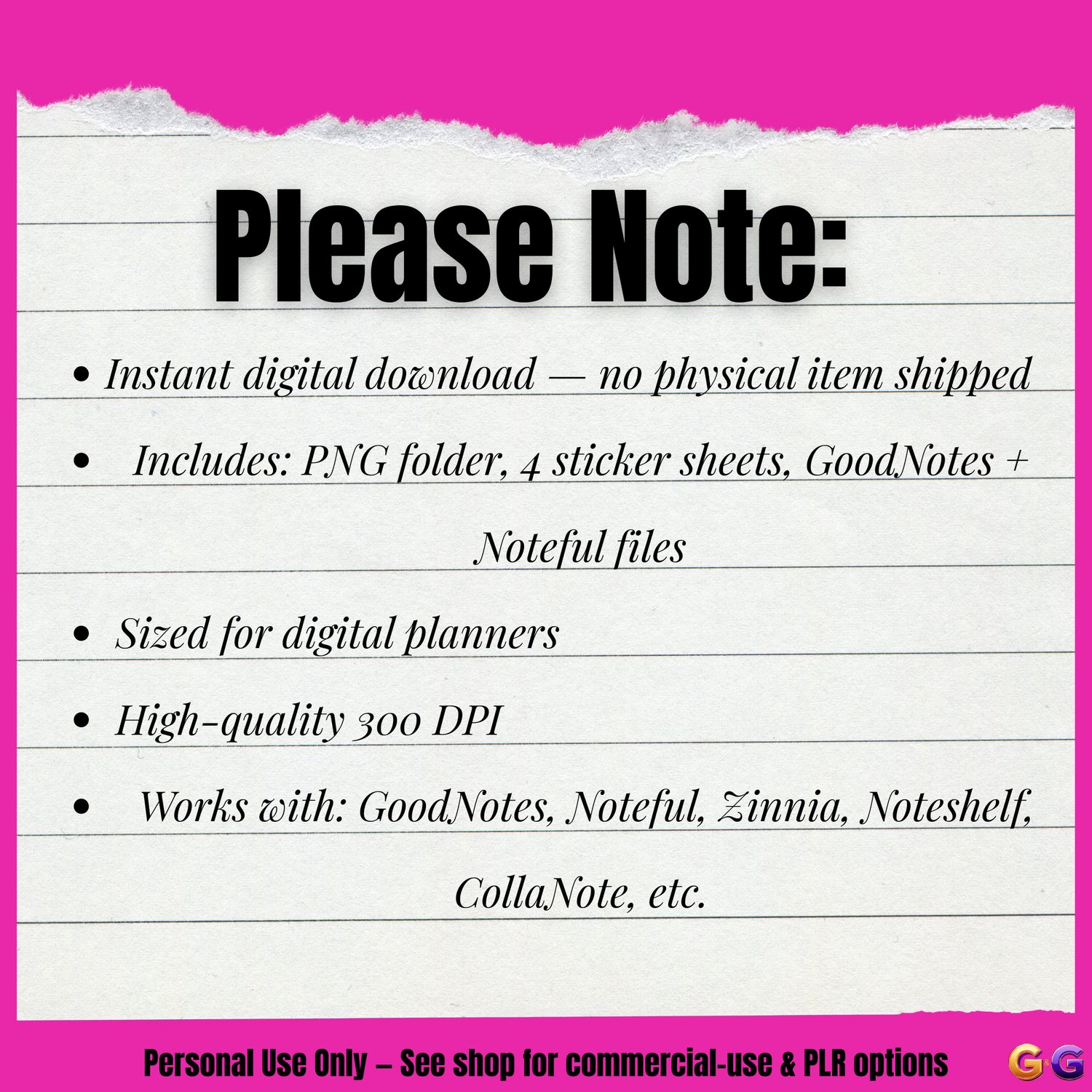 Instant access after purchase (PNG folder + GoodNotes file + Noteful file)