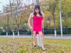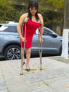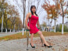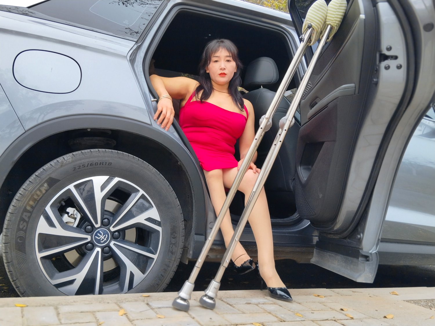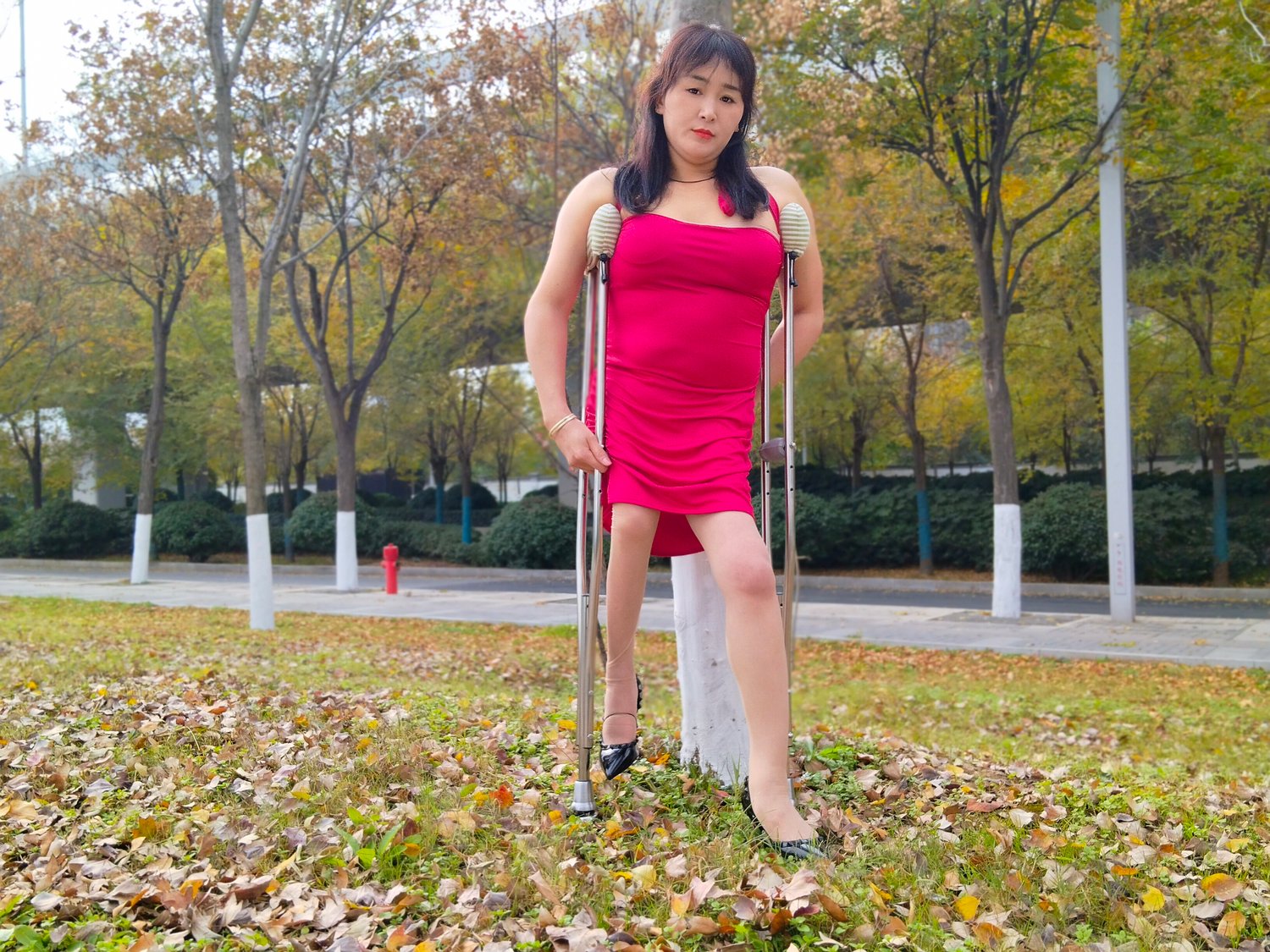 She’s out here rocking a bright red dress, classic high heels, and her trusty crutches, strutting through the autumn leaves like it’s her own runway. Even with a limp, she’s got all the confidence in the world—sitting on the path, adjusting her dress, and owning every step.