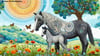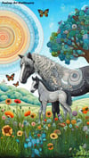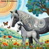 Beautiful black horse & white foal with spirograph patterns on green hills scattered with poppies & bluebells & a curly tree. There are butterflies & a spirograph sun & blue sky.