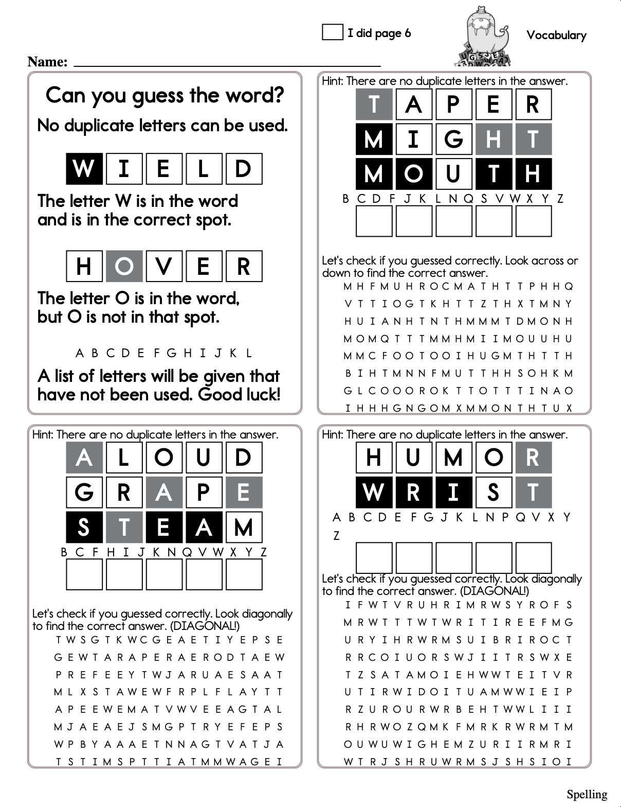 ✍️ Spelling & Grammar Workbooks – Weekly spelling lists, vocabulary activities, and grammar exercises.